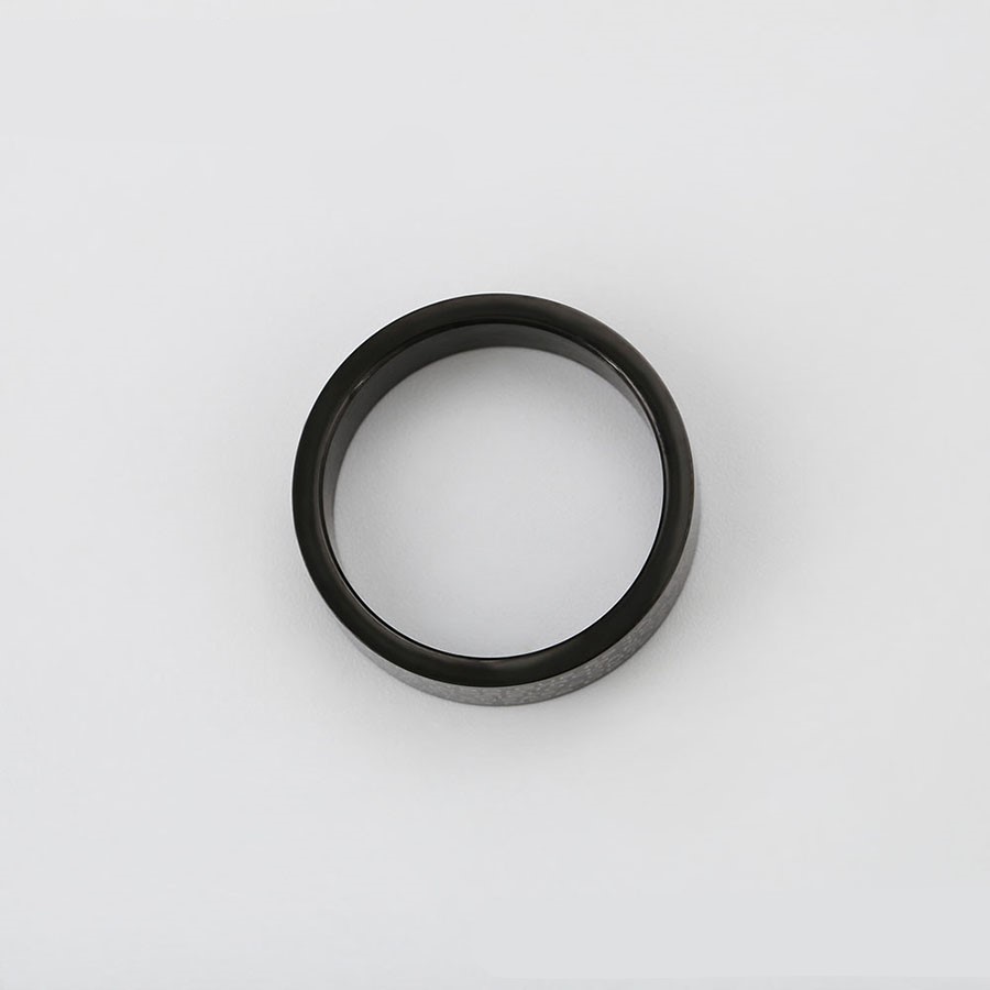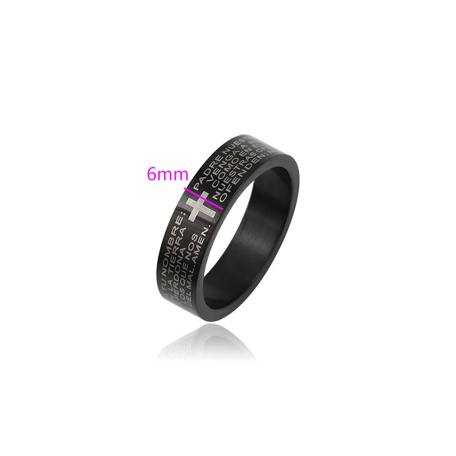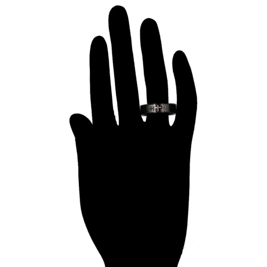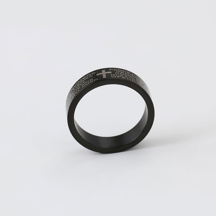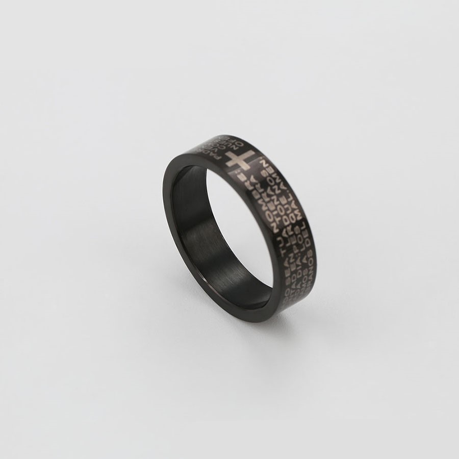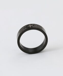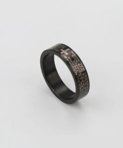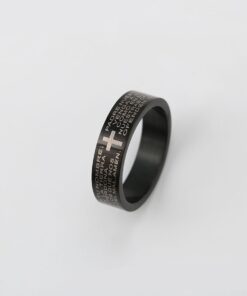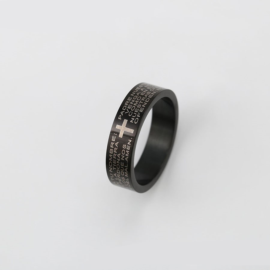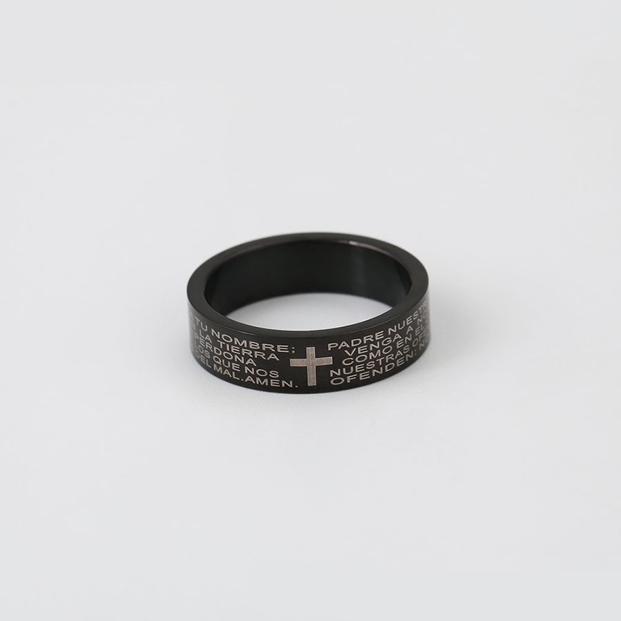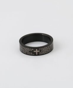 Elegante anillo elaborado en acero negro, grabado con el padre nuestro en todo el contorno externo del aro.