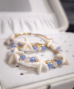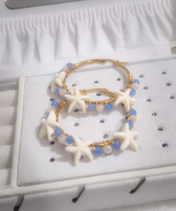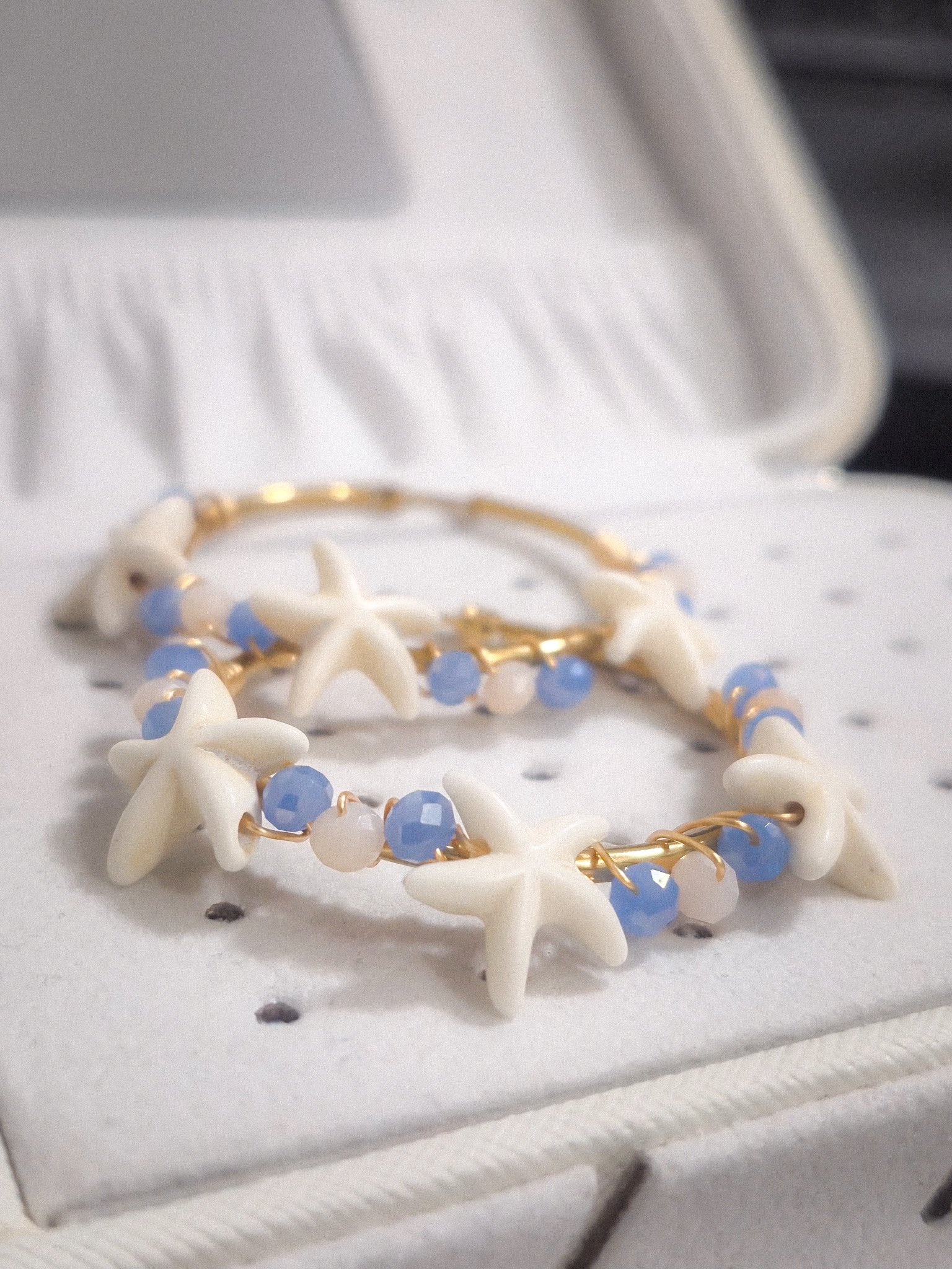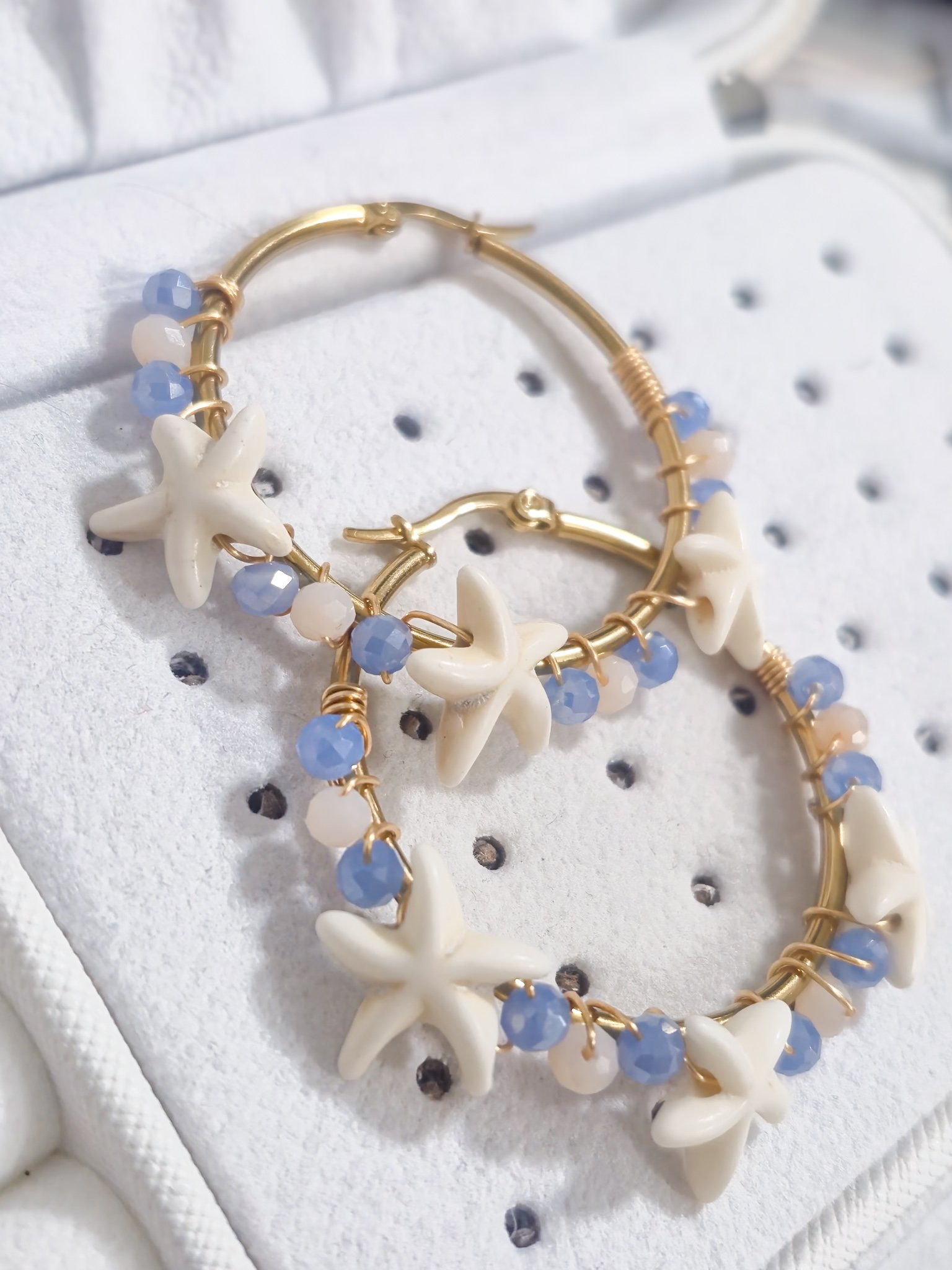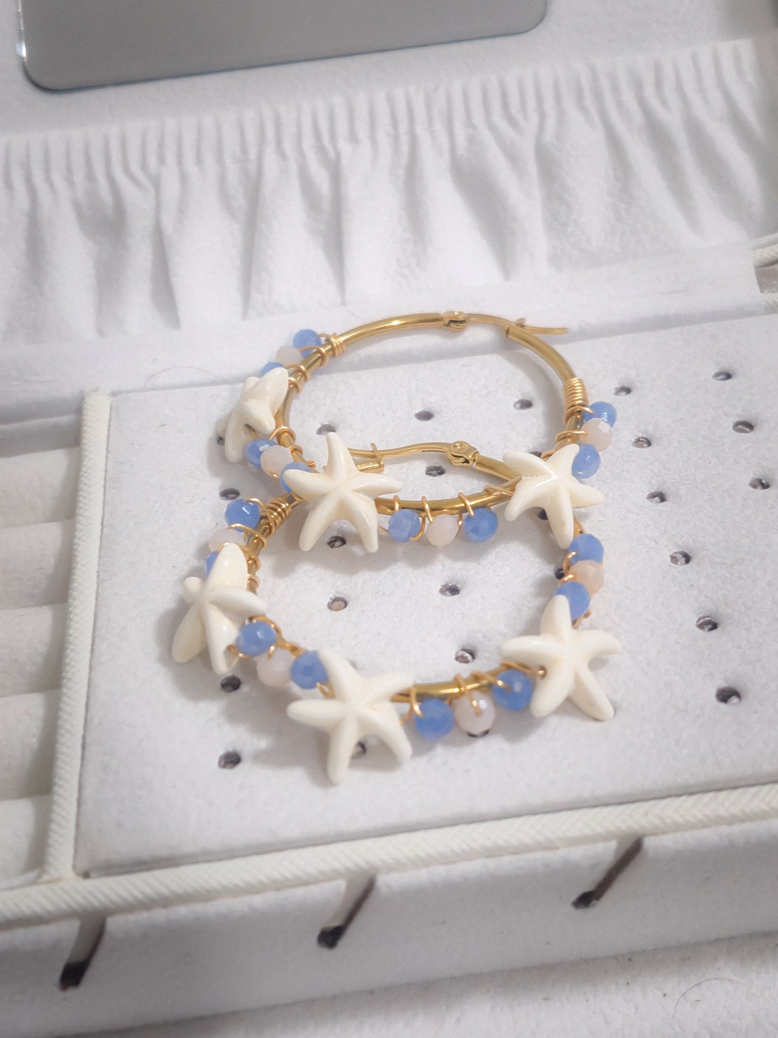 Hermosas argollar elaborada en acero quirúrgico 316l, alambre de cobre con baño de plata color dorado, cristales murano y estrella acrílica color blanco, tejidas a mano.