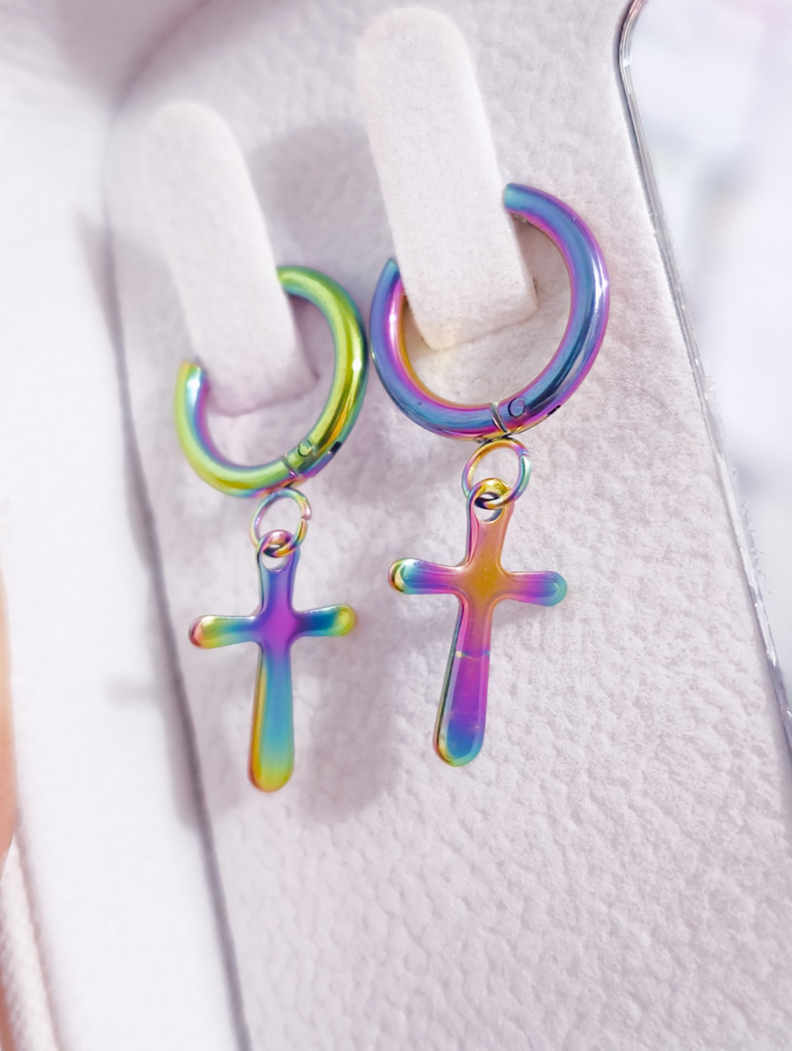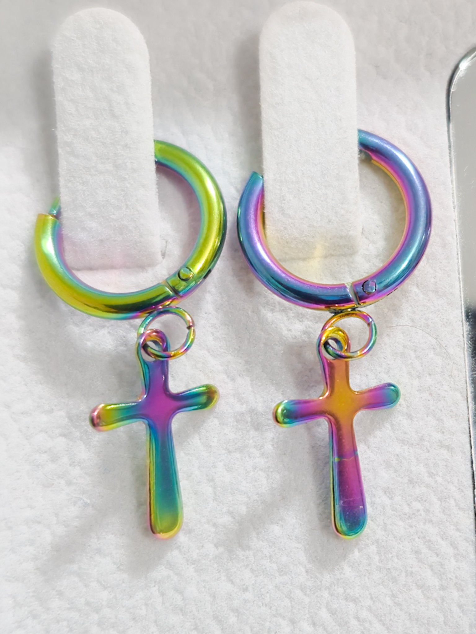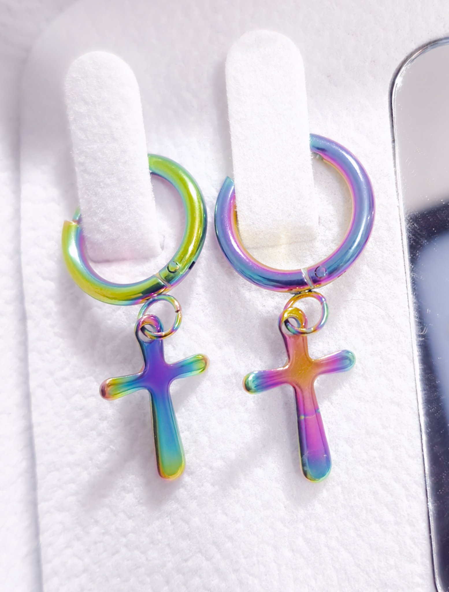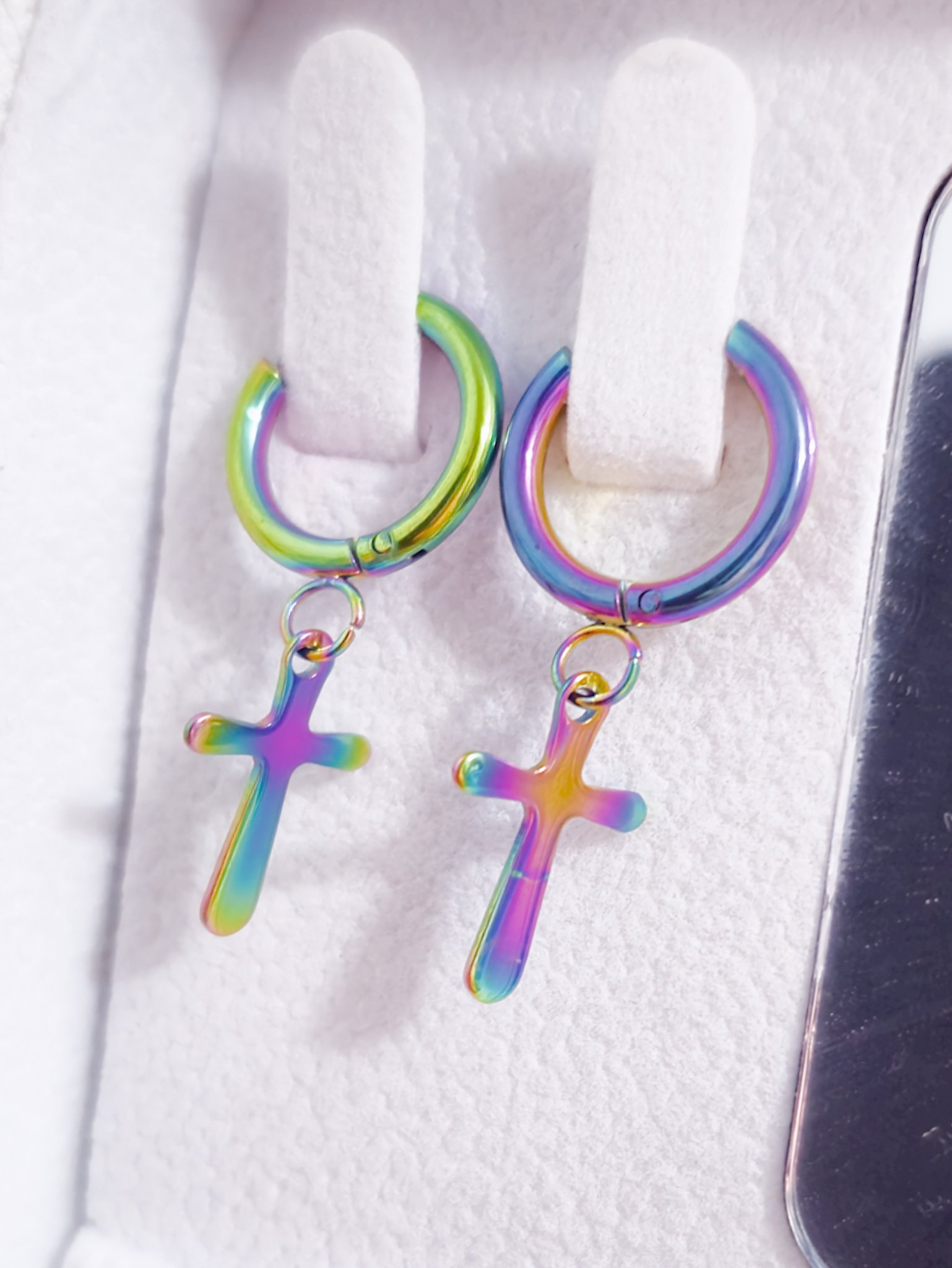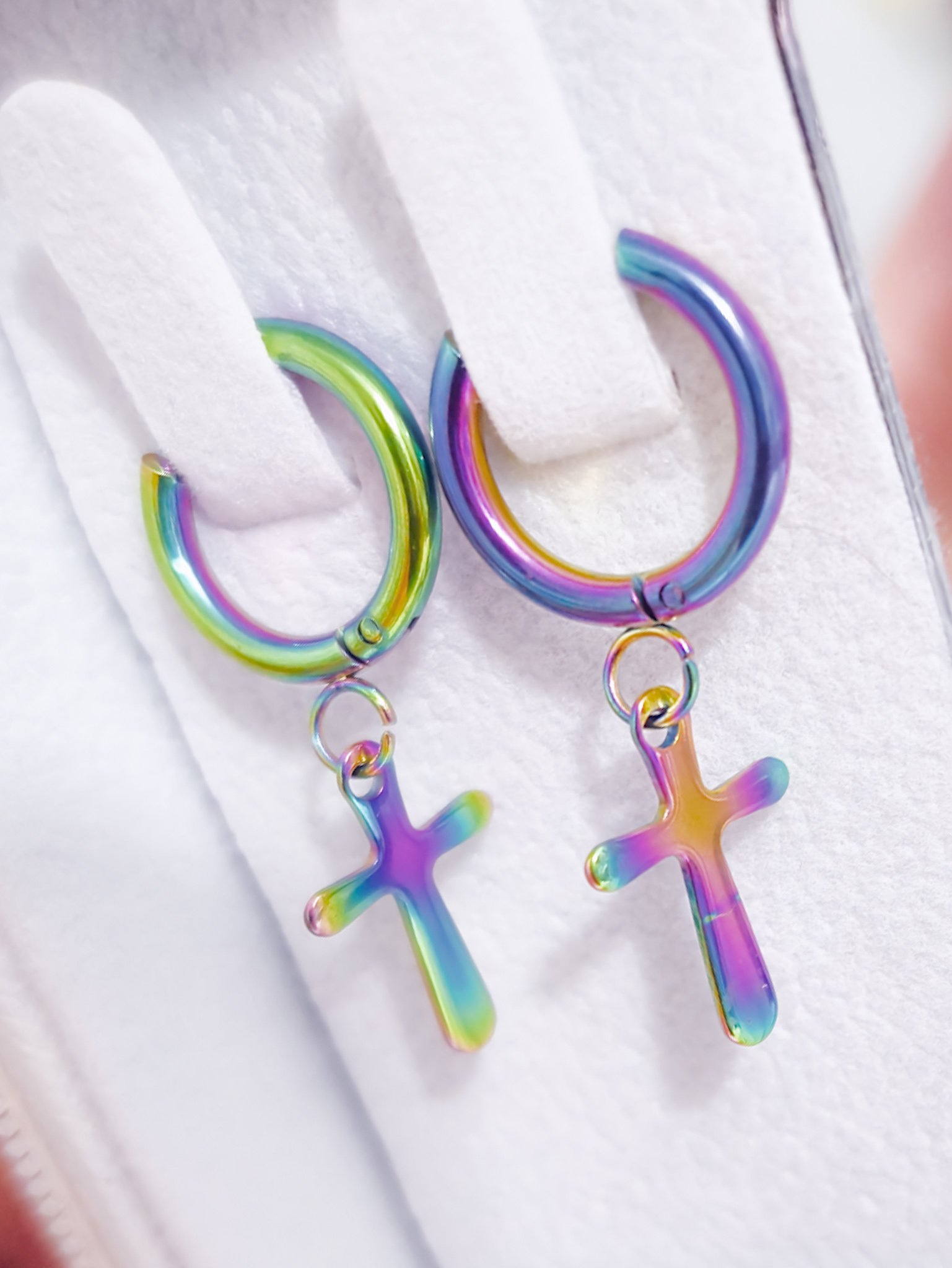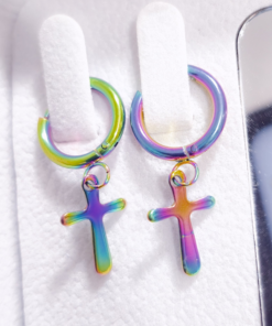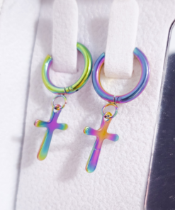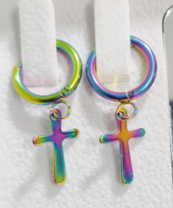 Modernos y llamativos, estos aretes tipo argolla están elaborados en acero quirúrgico 316L, lo que garantiza resistencia, durabilidad y que sean hipoalergénicos. Cuentan con un diseño de cruz colgante y un acabado multicolor iridiscente que refleja tonos vibrantes como morado, verde, azul y dorado, aportando un estilo único y versátil.
