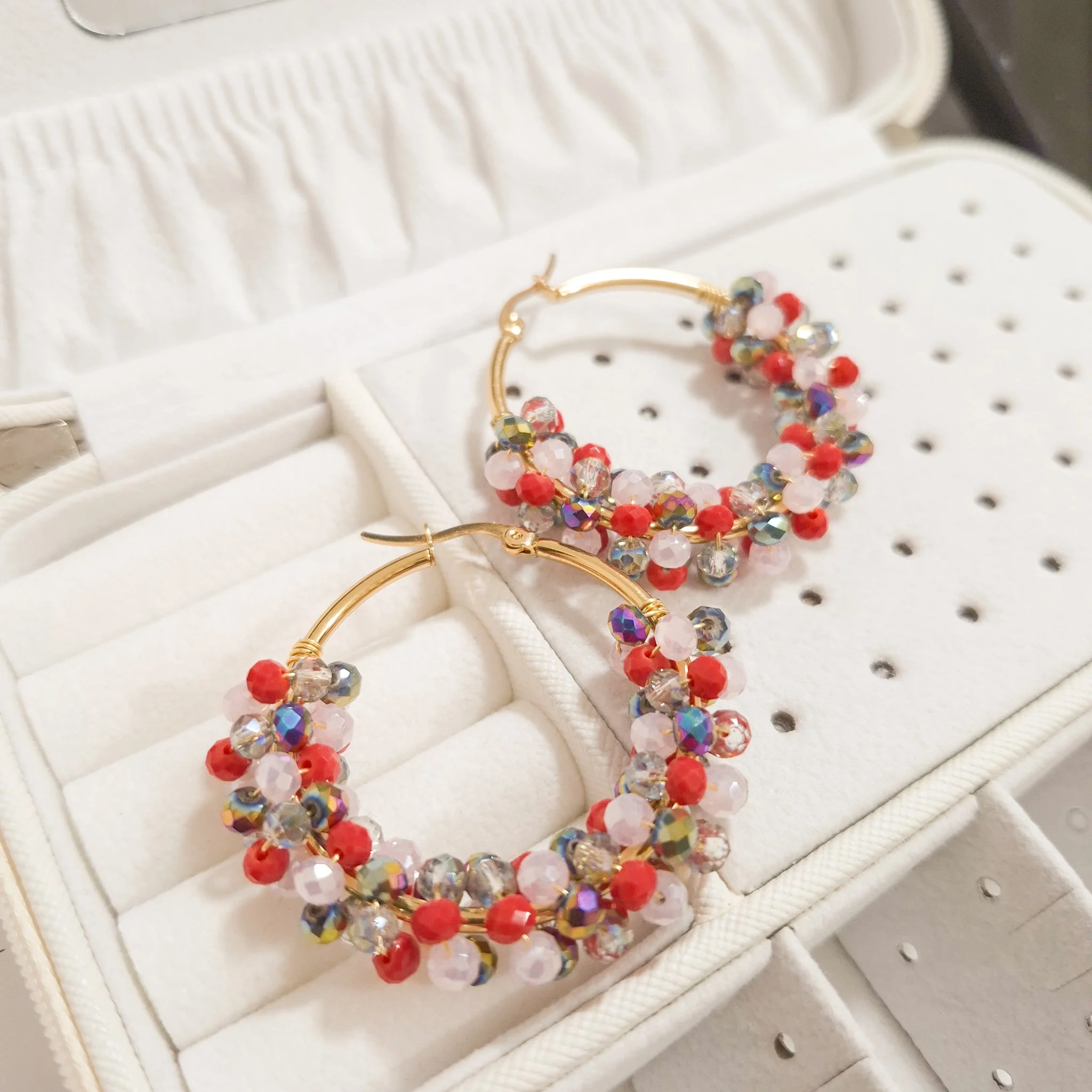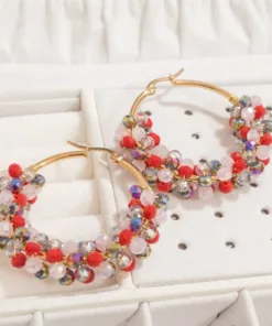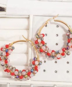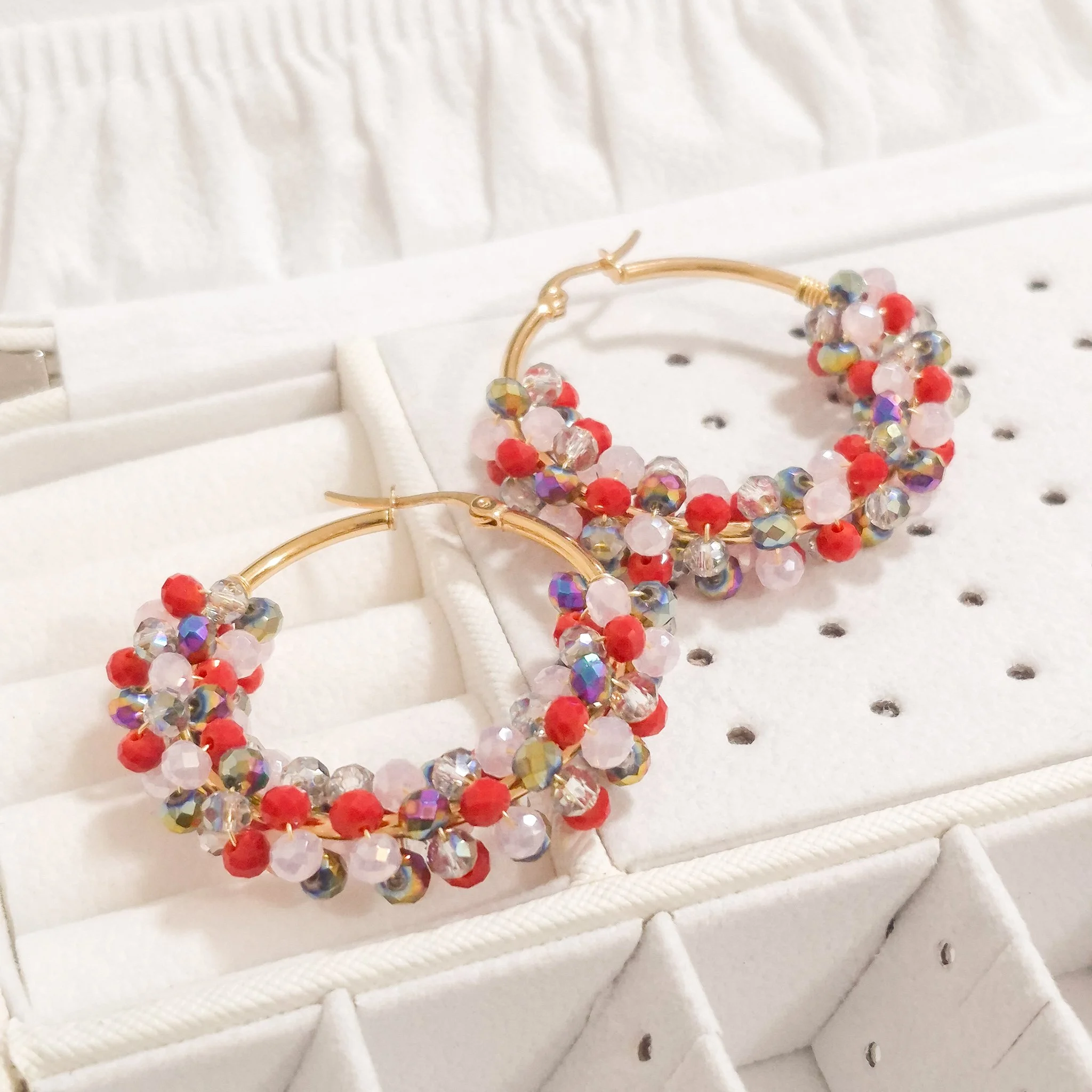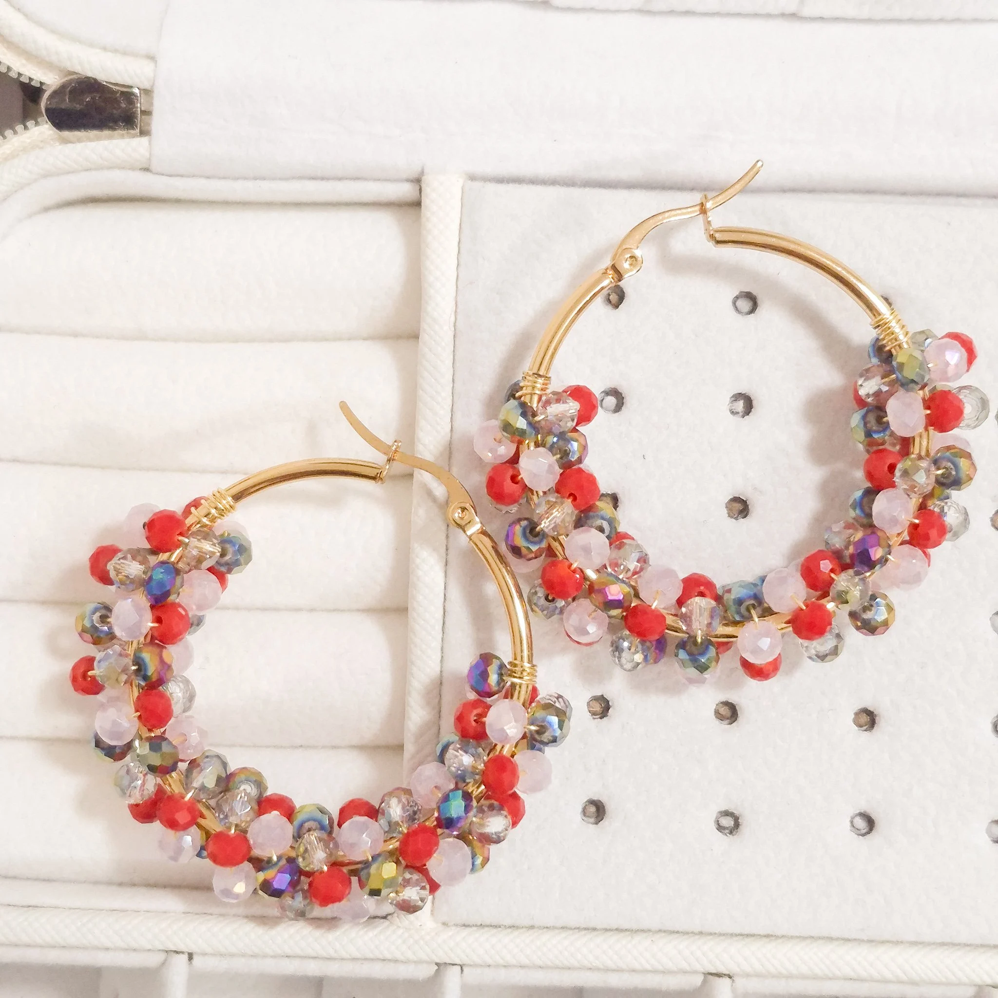 Lindos aretes elaborado con argolla de acero quirúrgico 316l y cristal murano tornasolado, tejidos en material americraf supply.