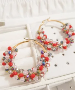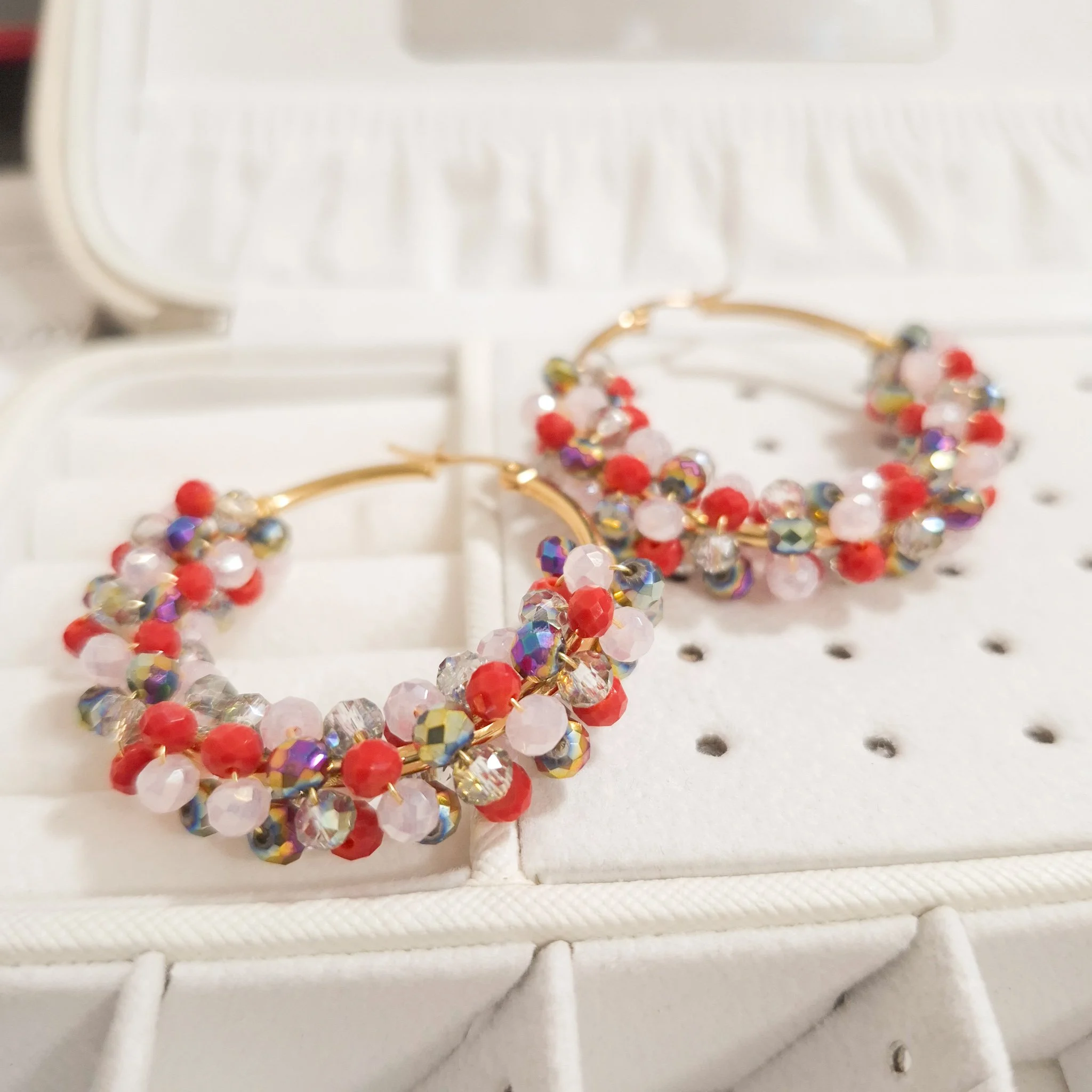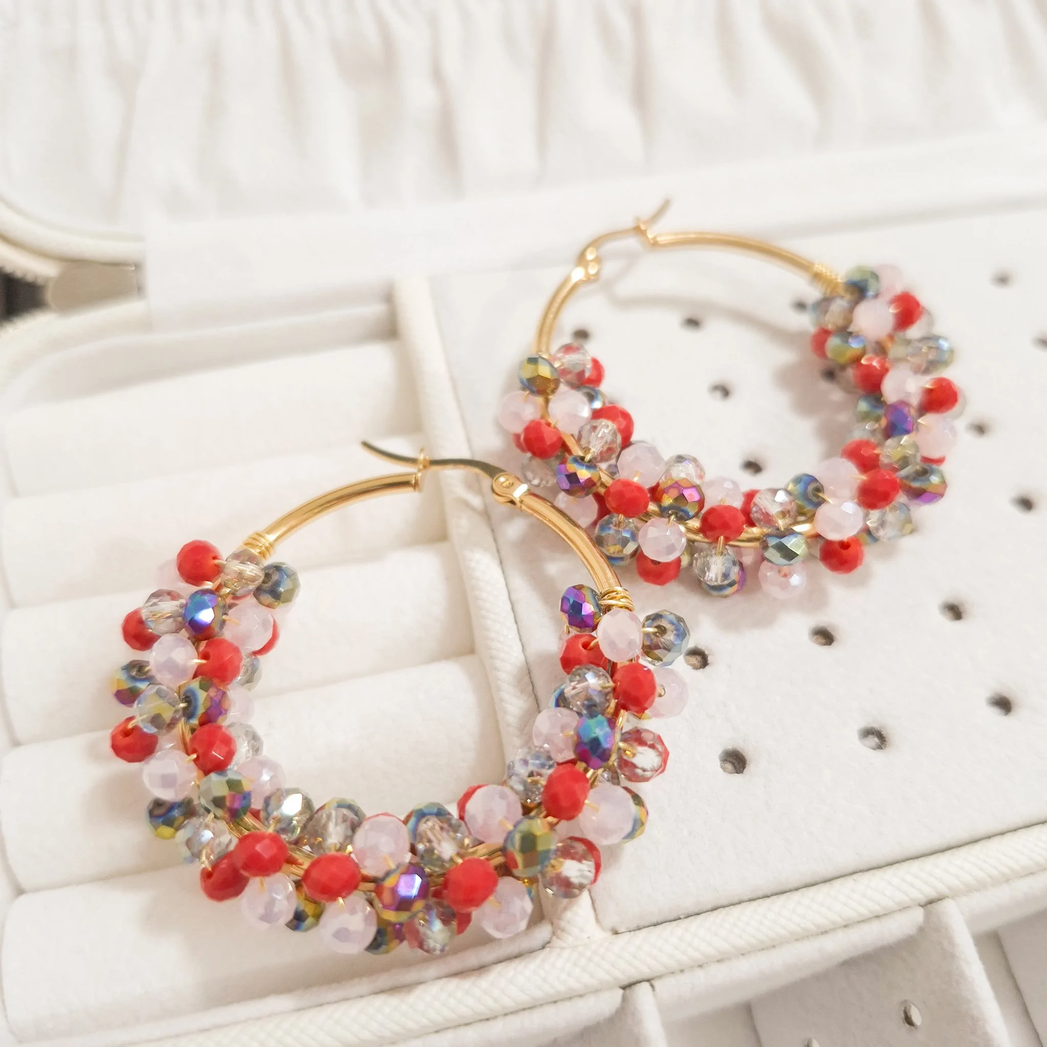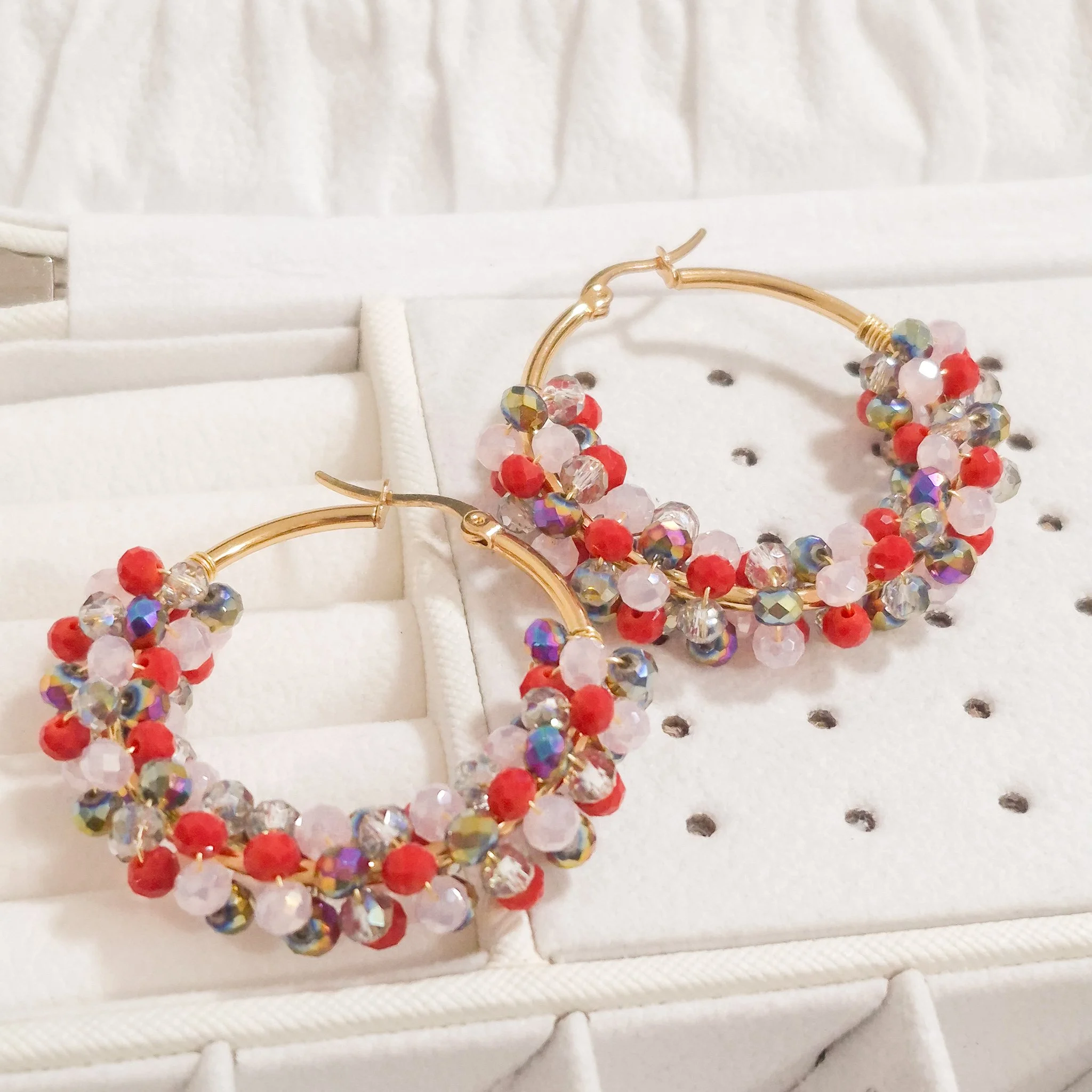 Lindos aretes elaborado con argolla de acero quirúrgico 316l y cristal murano tornasolado, tejidos en material americraf supply.