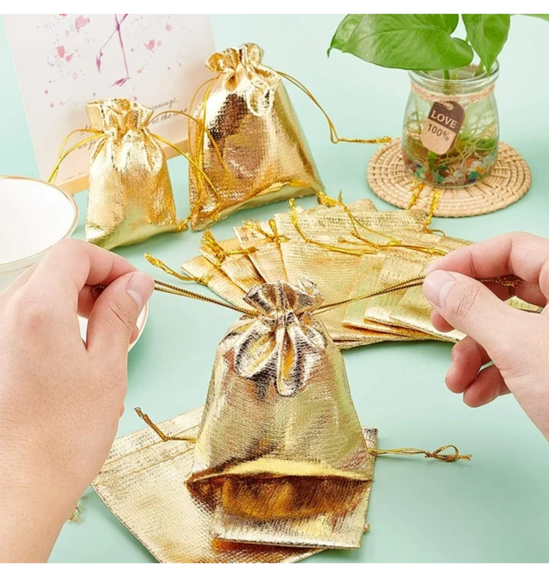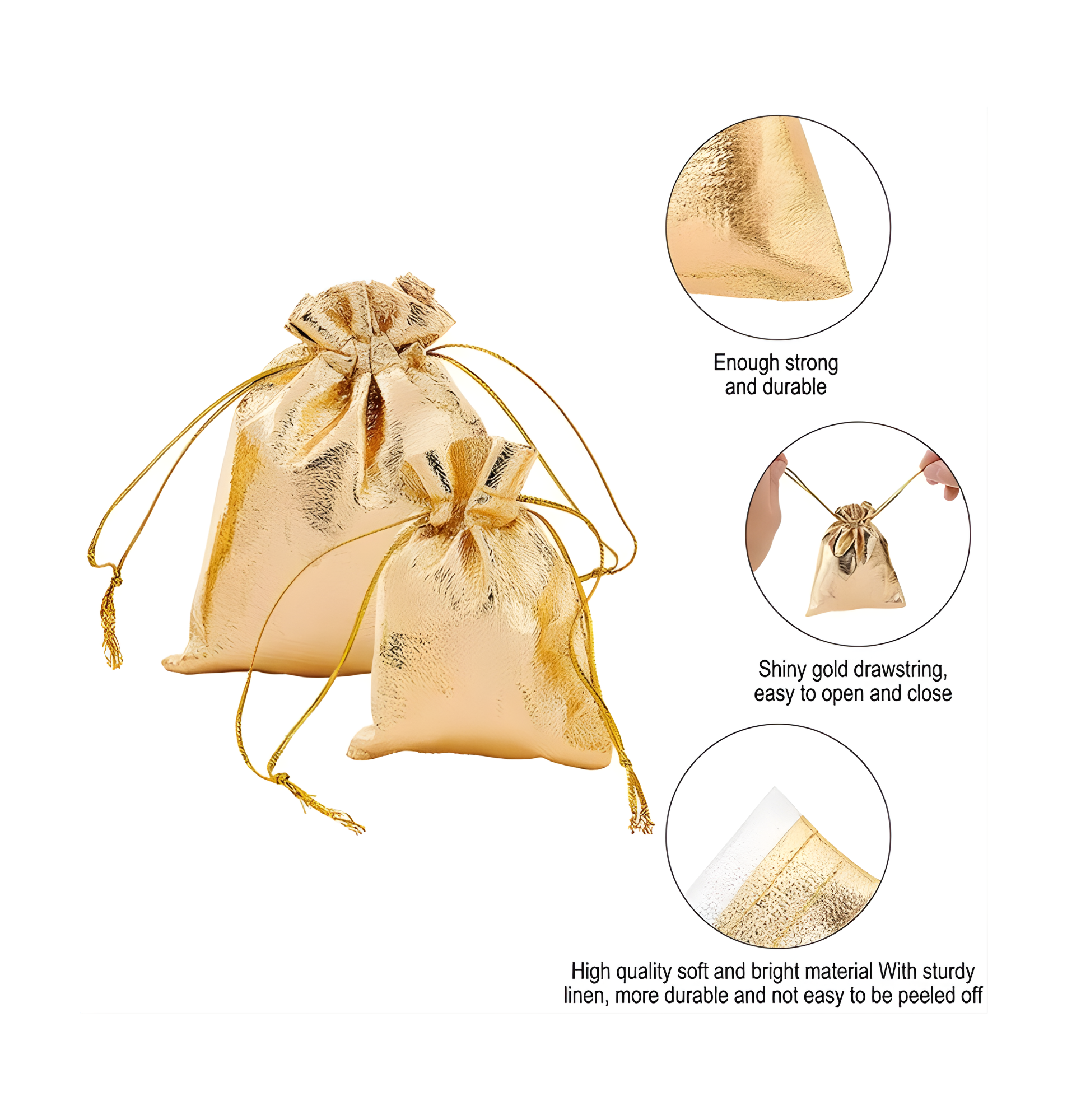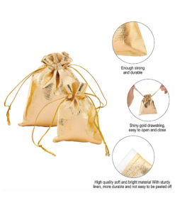 Perfecto para embalaje de joyas o artículos pequeños. Color brillante: estas hermosas bolsas de regalo son doradas, adecuadas para regalos, joyas, embalaje de artículos pequeños, bolsas atractivas para festivales.Material de alta calidad: la bolsa de regalo con cordón está hecha de tela dorada metálica brillante; suave y resistente, no rígida ni endeble, y la tela dorada no es fácil de despegar.Uso versátil: perfecto para guardar regalos, regalos y joyas: aretes, pulseras, collares, relojes, dulces, frijoles, granos de café, jabón hecho a mano, flores secas, regalos de Navidad, regalos de recepción de bodas, lavanda, etc. Bolsas versátiles: estas bolsas doradas son hermosas bolsas de joyería, bolsas de dulces, perfectas para festivales y celebraciones como el Día de San Valentín, Día de la Madre, cumpleaños, bodas, despedidas de soltera, graduación, Navidad , etc.