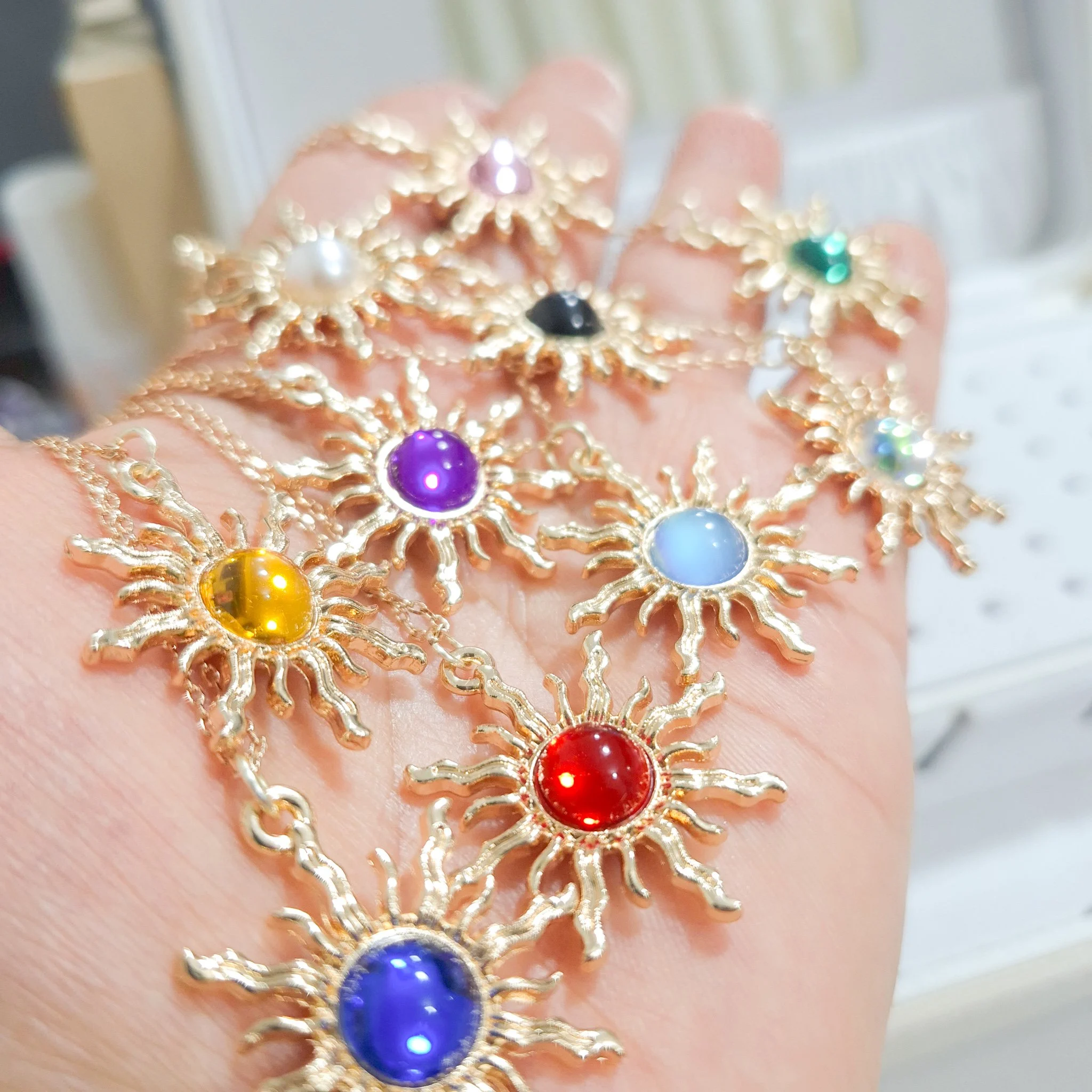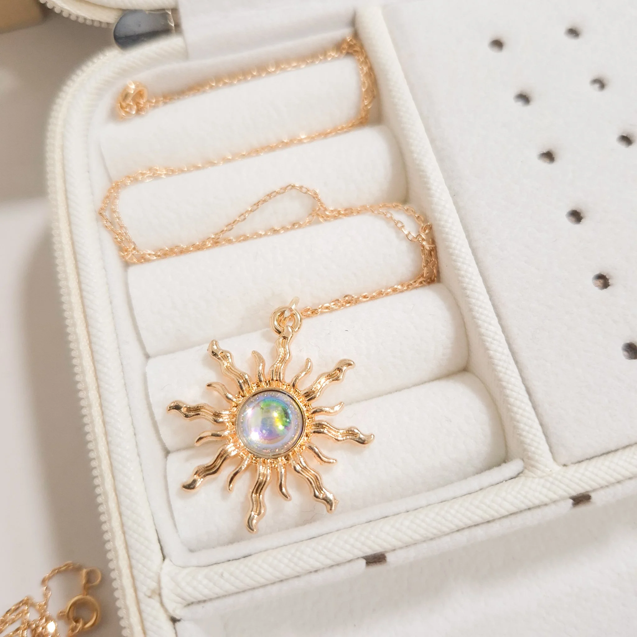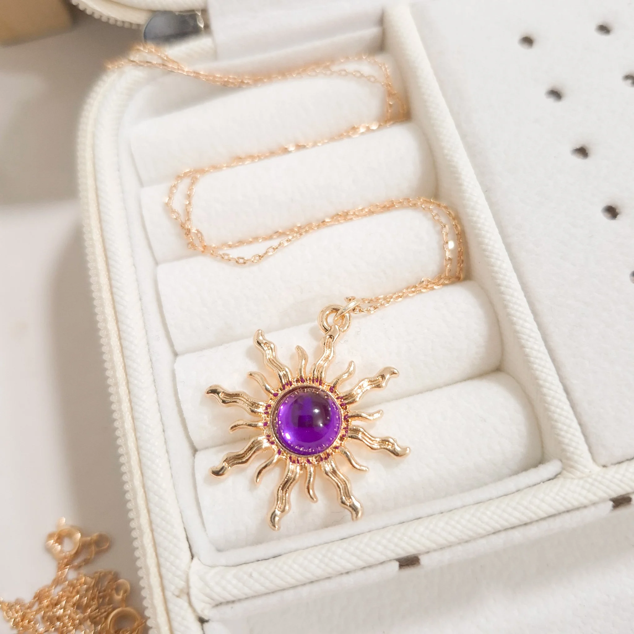 Elegante y hermoso collar elaborado en acero quirúrgico 316l enchapado en oro rosé 24k, con dije en forma sol con piedras de color.