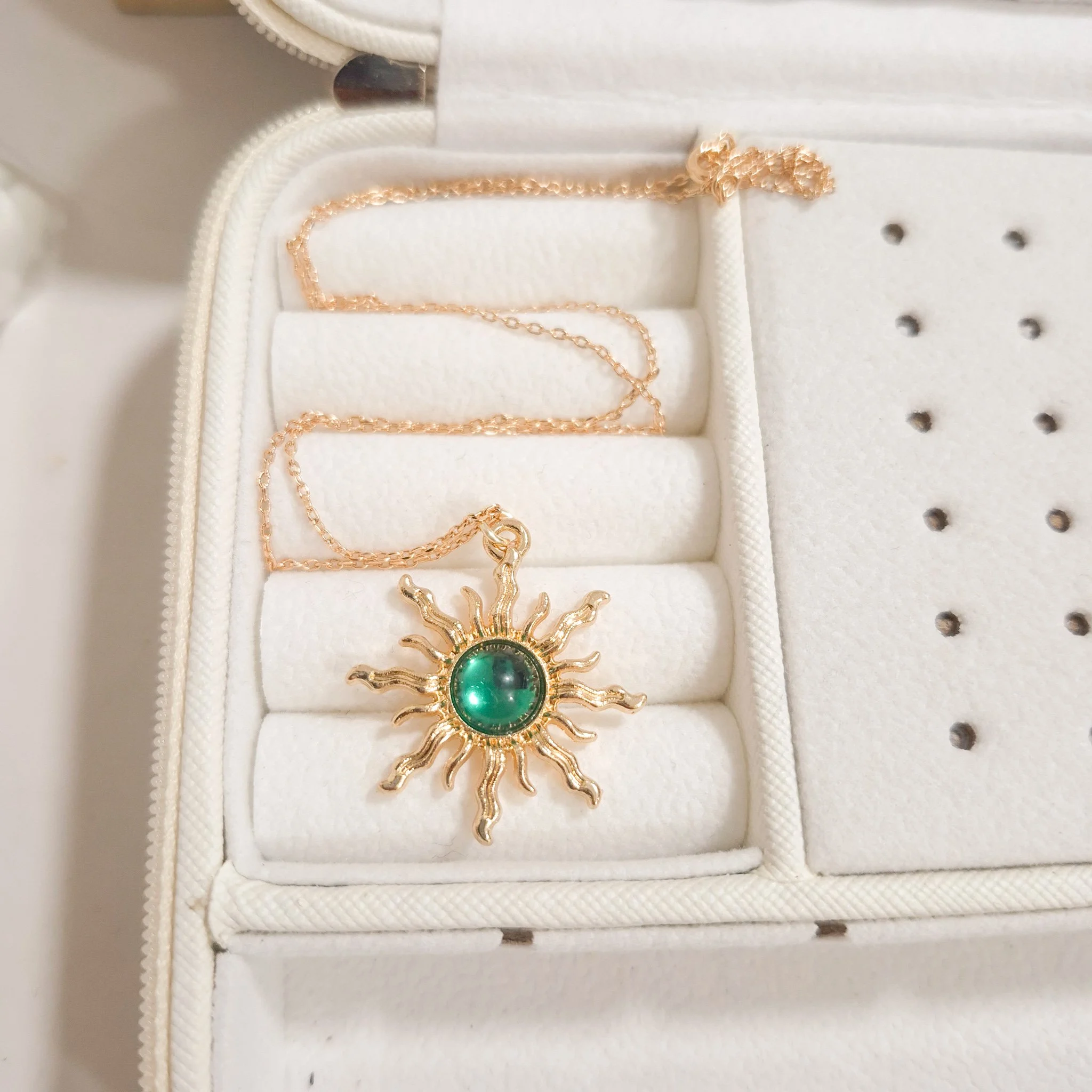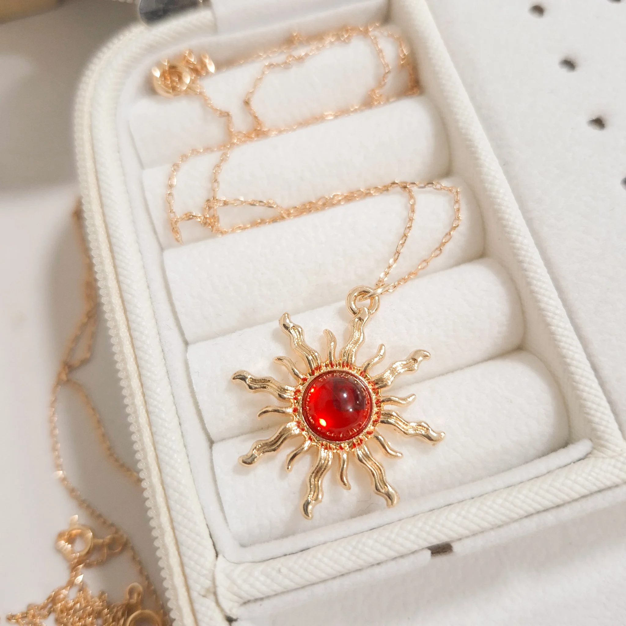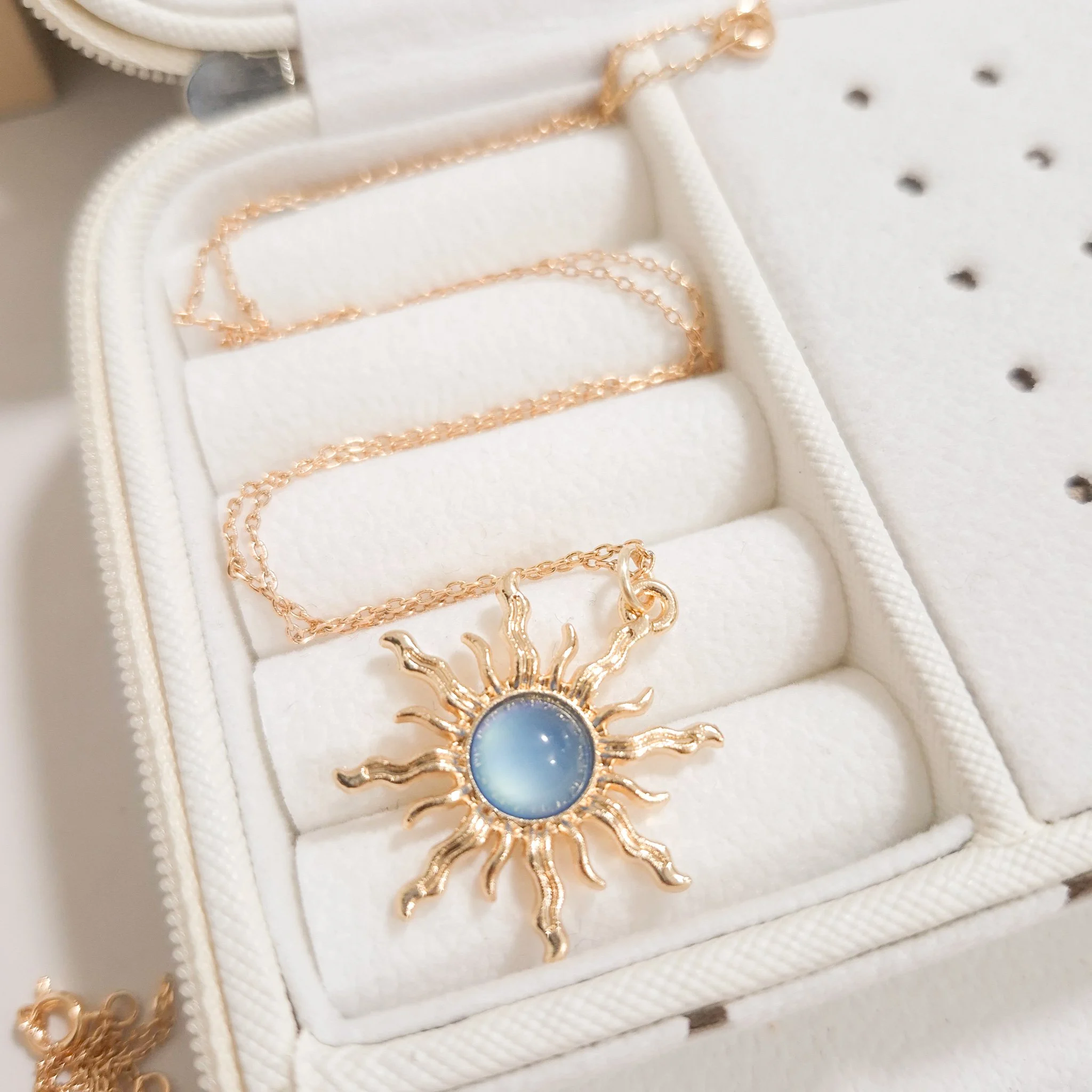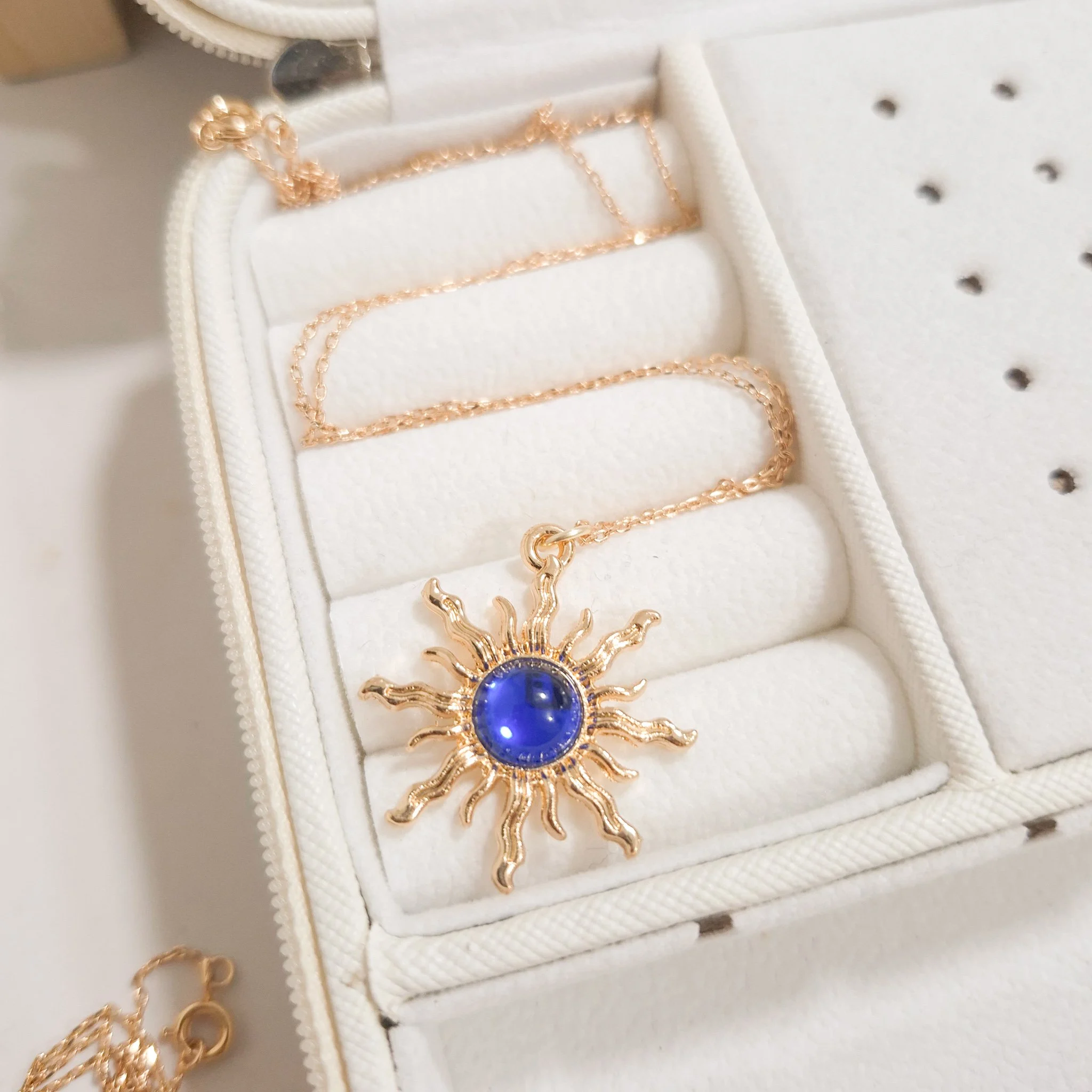 Elegante y hermoso collar elaborado en acero quirúrgico 316l enchapado en oro rosé 24k, con dije en forma sol con piedras de color.