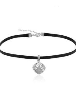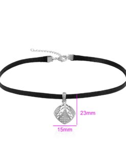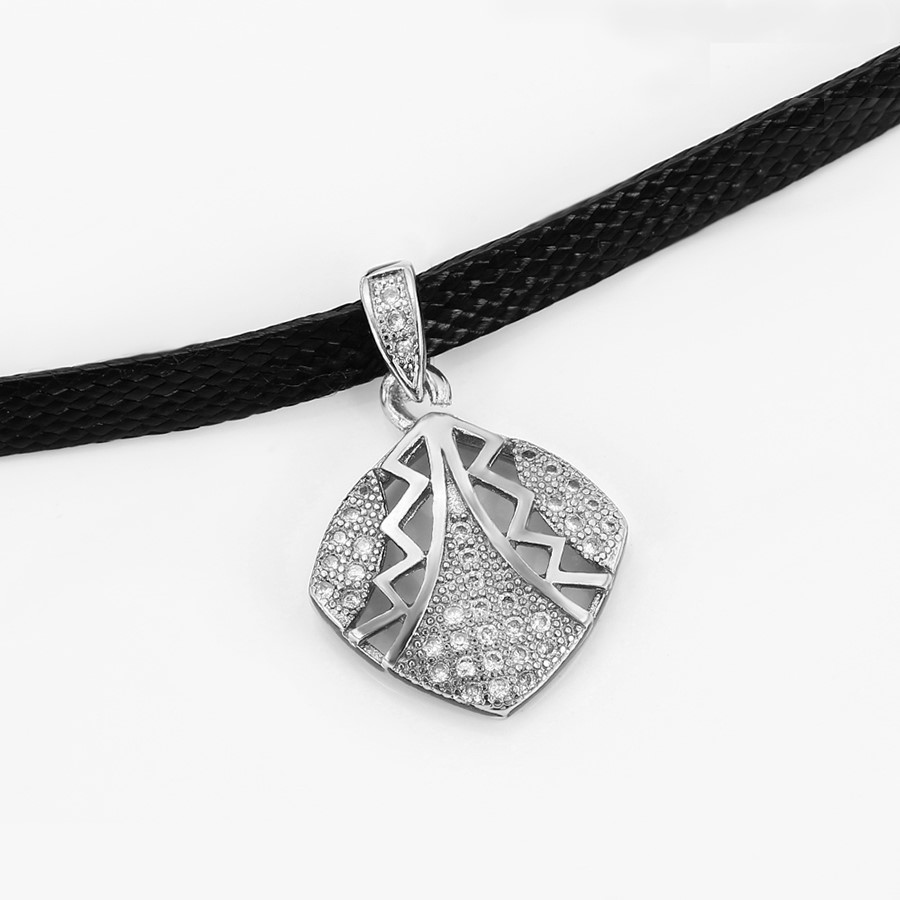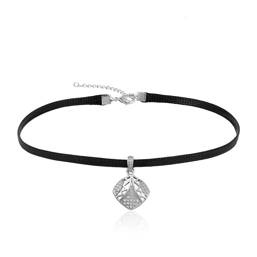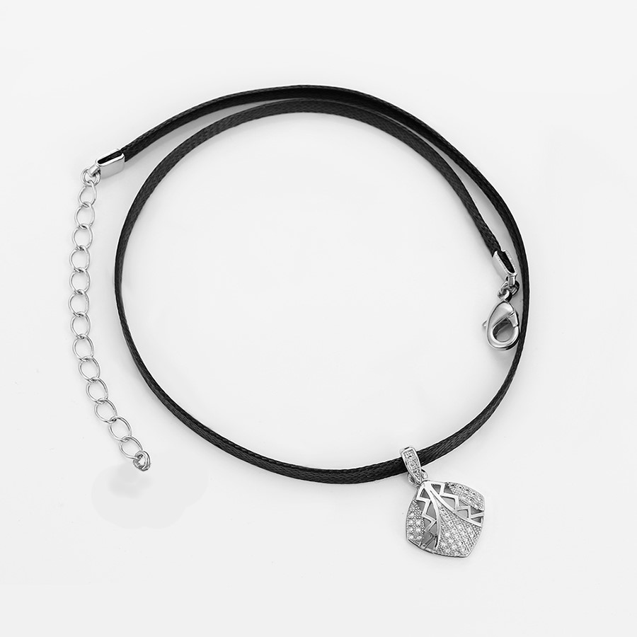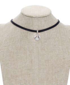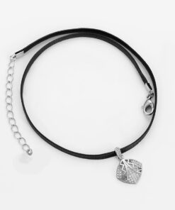 Hermoso, exclusivo y casual collar de cinta de cuero sintético, dije elaborado en acero quirúrgico 316l, con doble baño de plata de ley 925, e incrustación de cristales swarovski, tiene cadena de extensión.