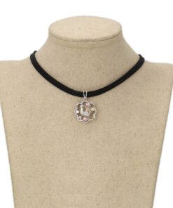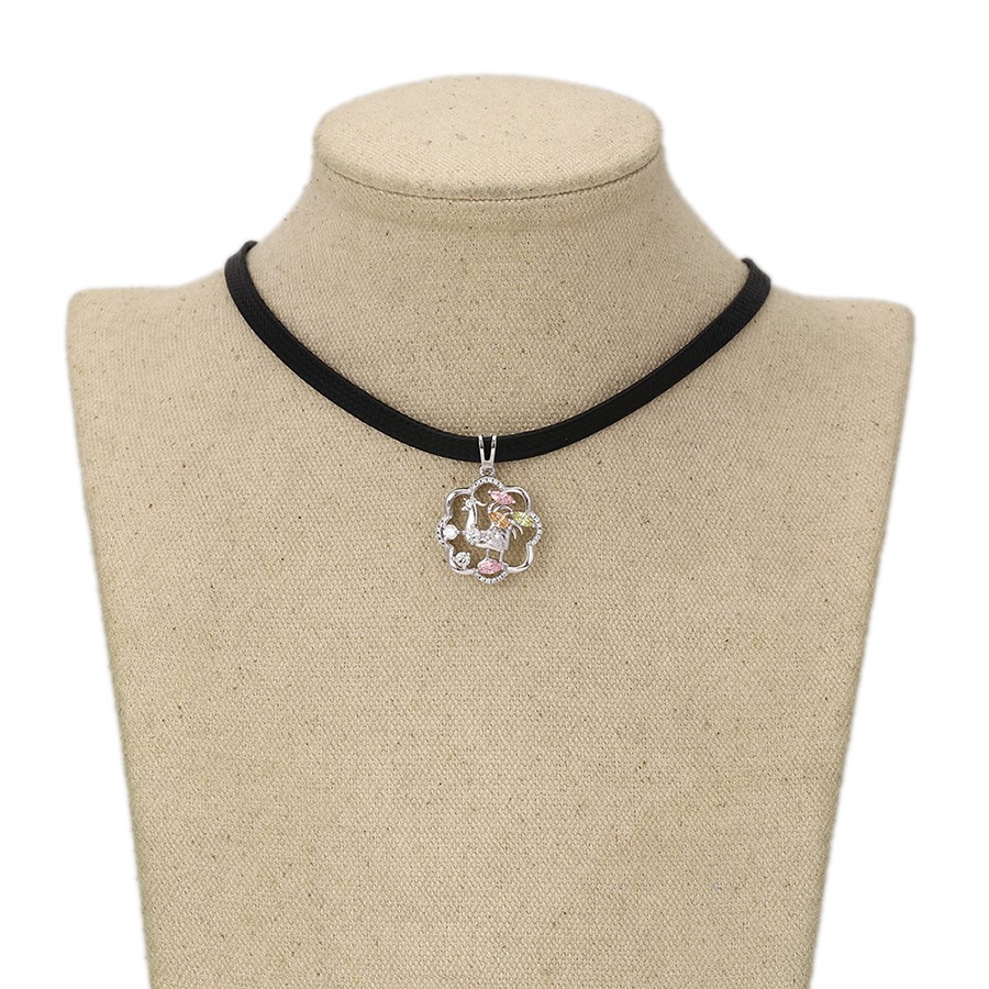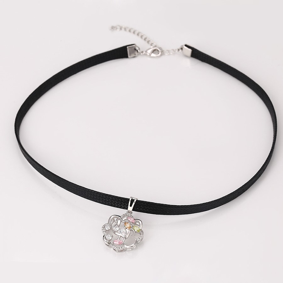 Hermoso, exclusivo y casual collar de cinta de cuero sintético, dije elaborado en acero quirúrgico 316l, con doble baño de plata de ley 925, e incrustación de cristales swarovski, tiene cadena de extensión.