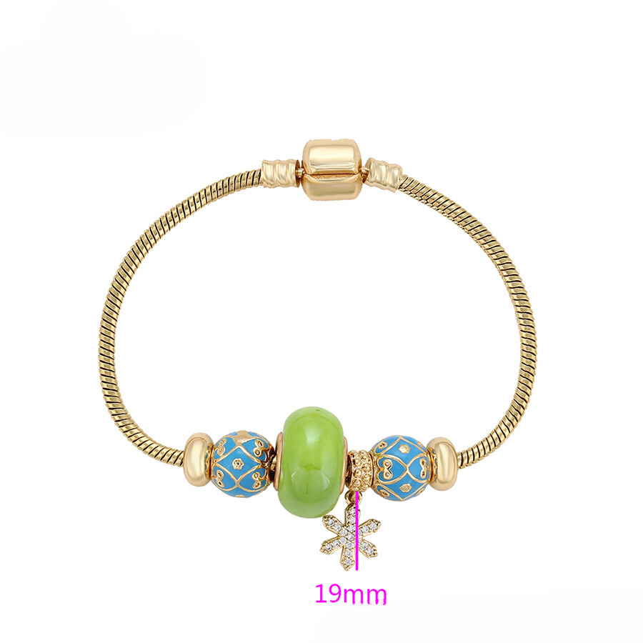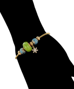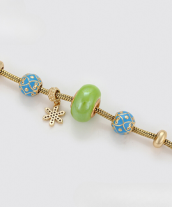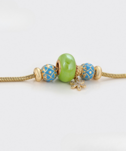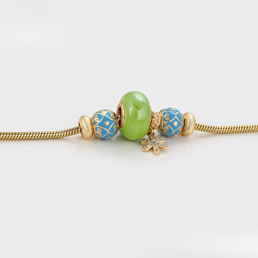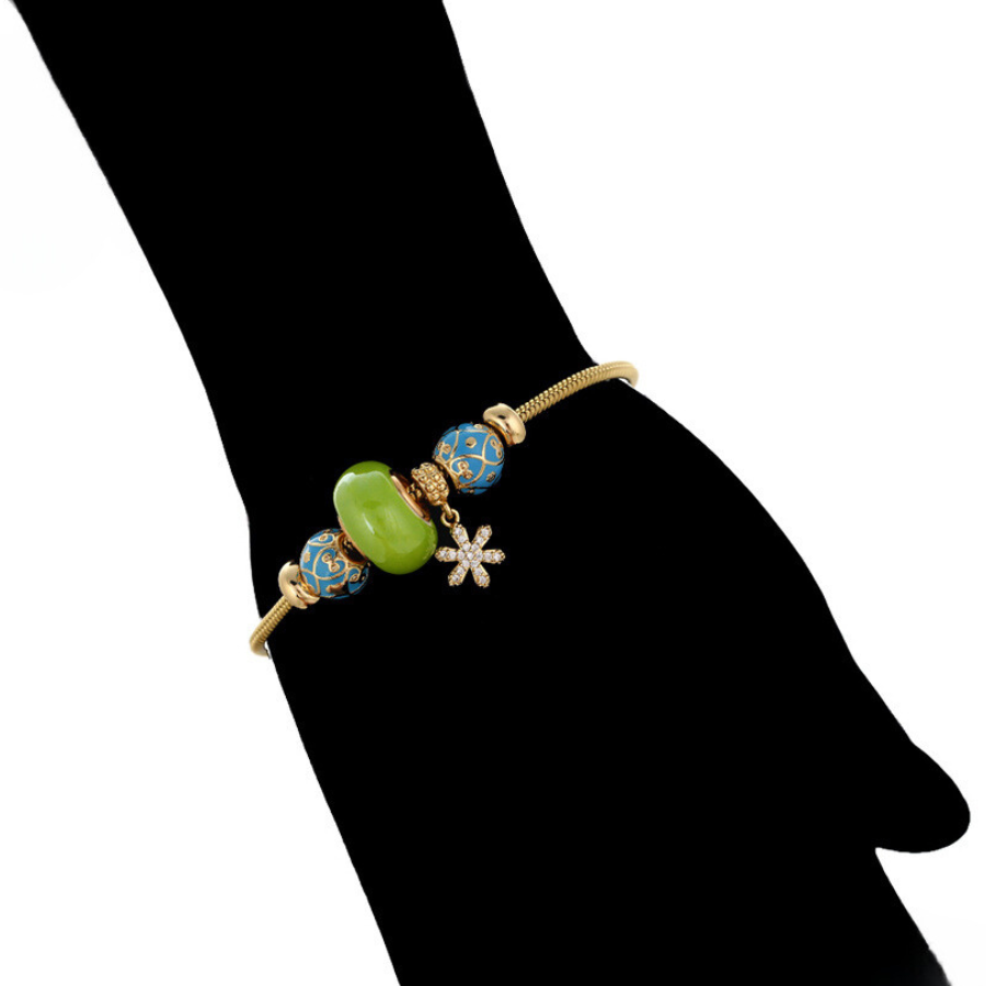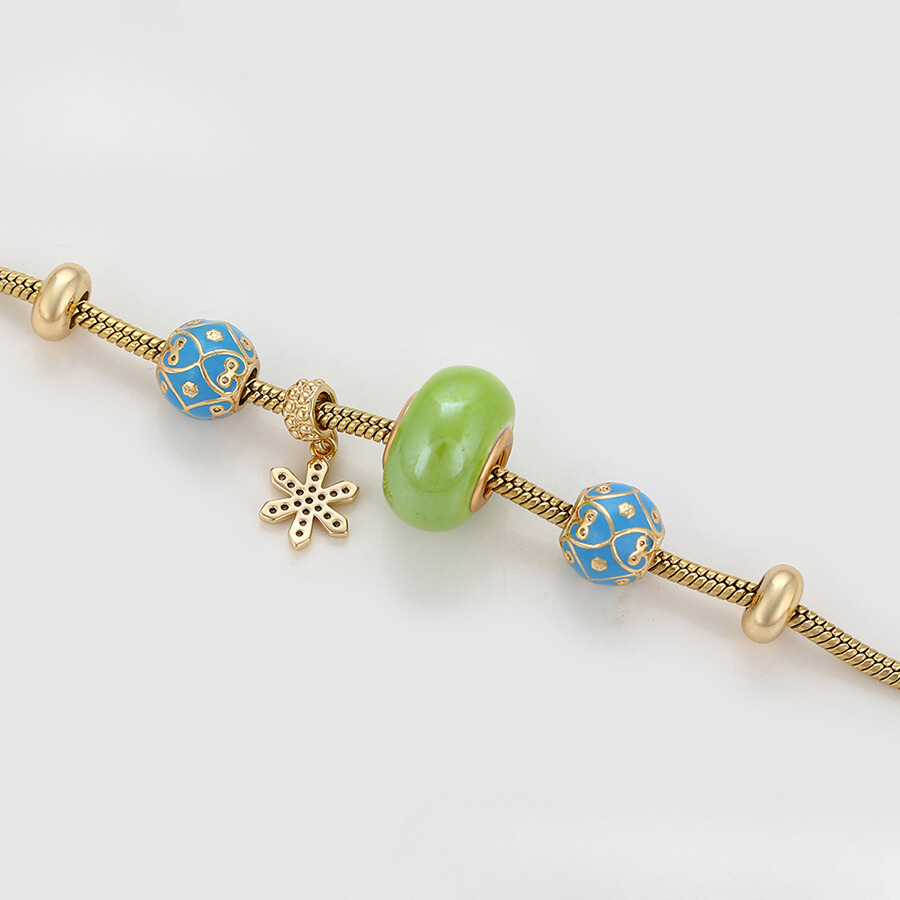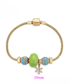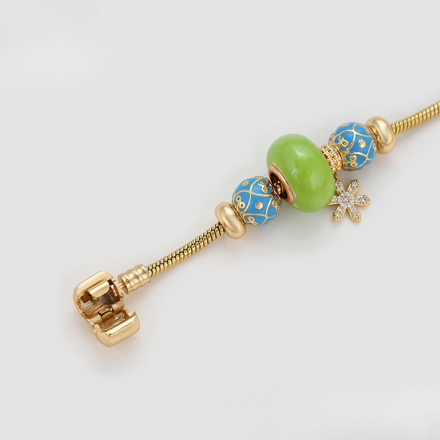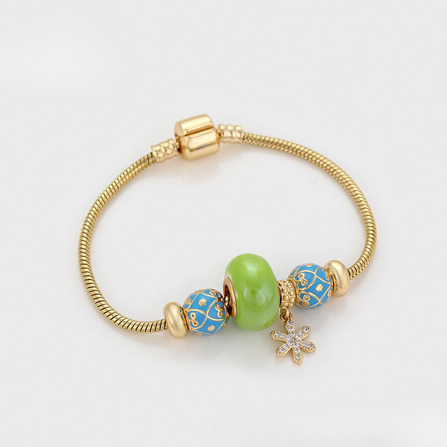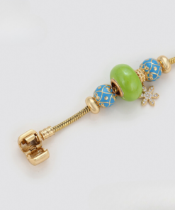 Linda pulsera estilo pandora, elaborada en acero, con doble enchape de oro dorado de 18k, e incrustación de cristal.