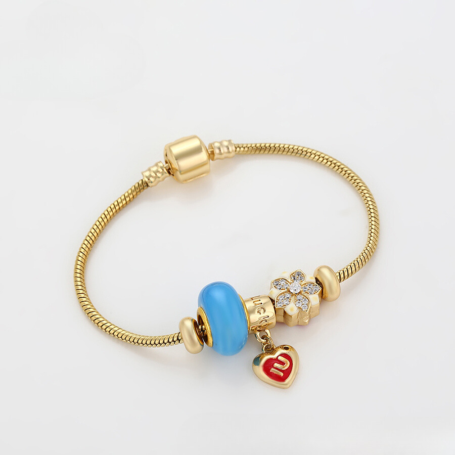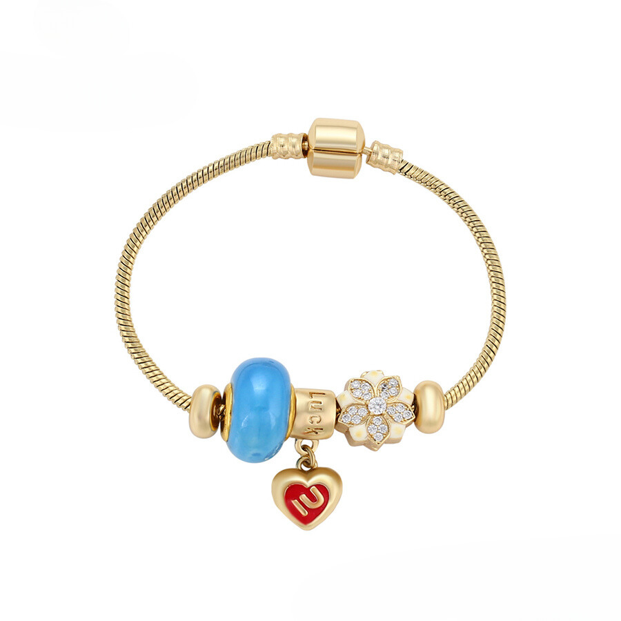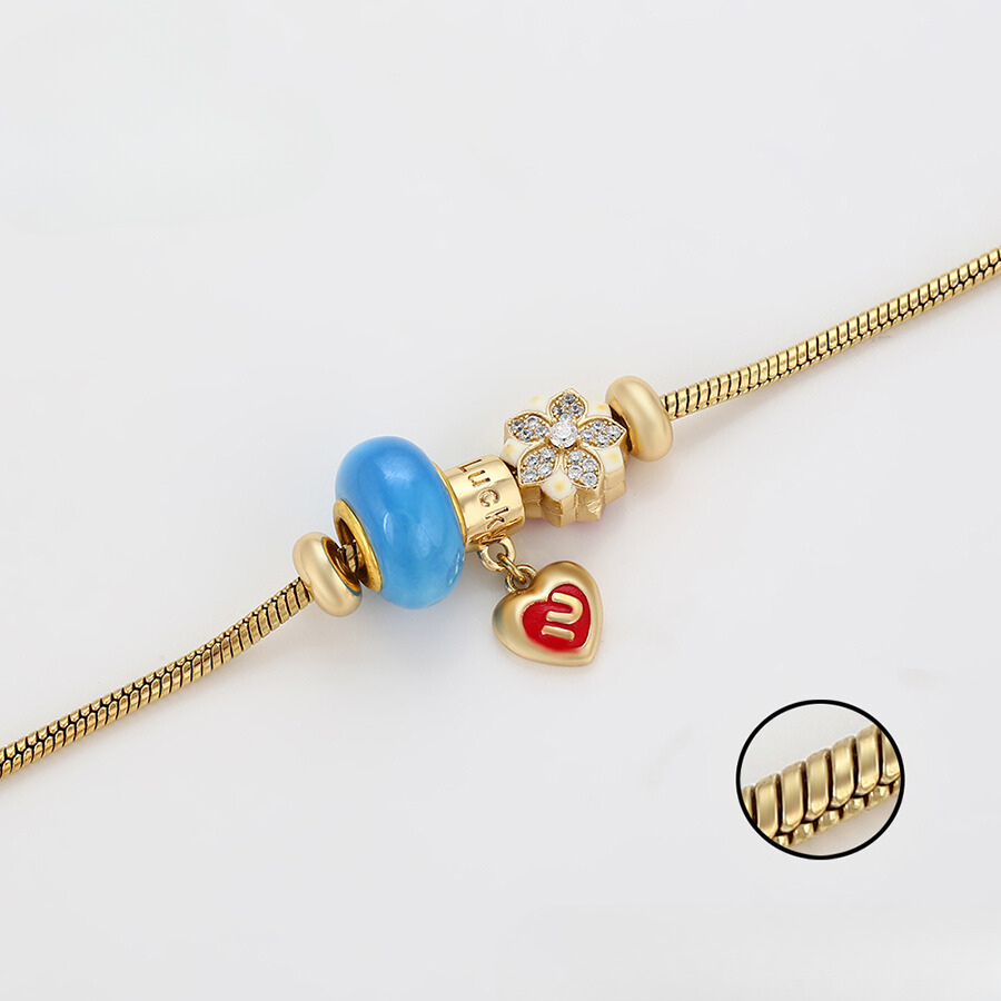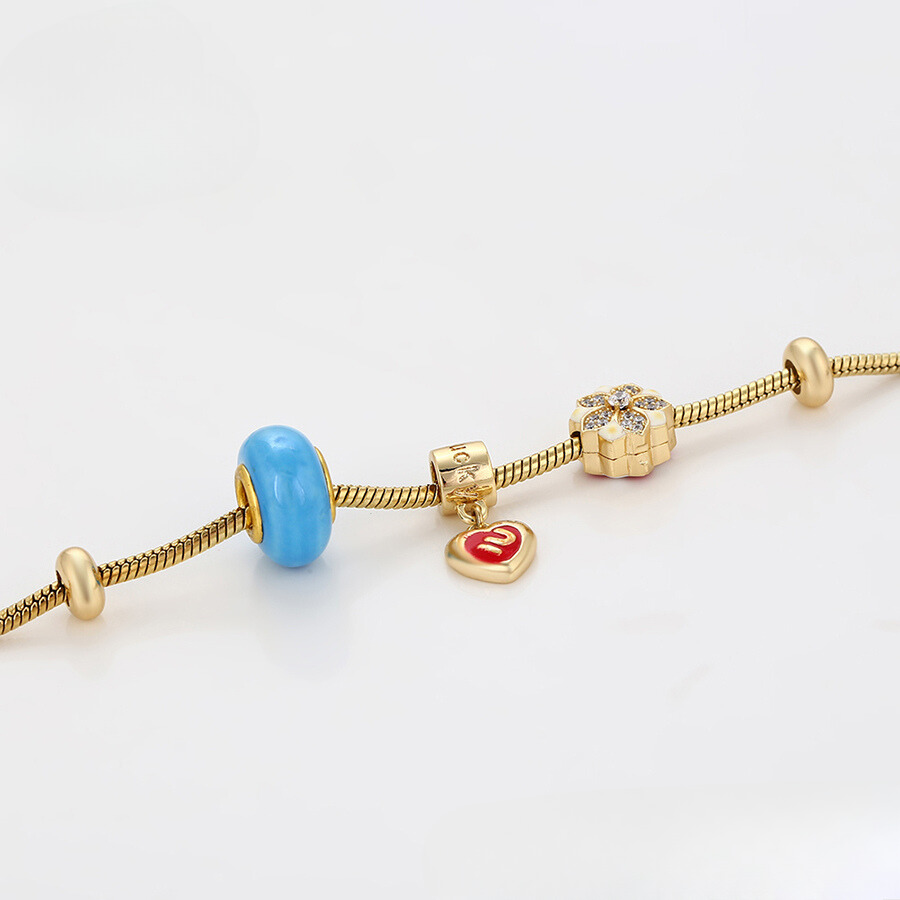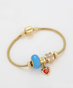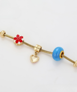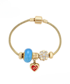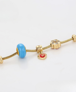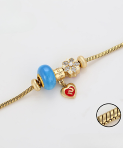 Linda pulsera estilo pandora, elaborada en acero, con doble enchape de oro dorado de 18k, e incrustación de cristal.