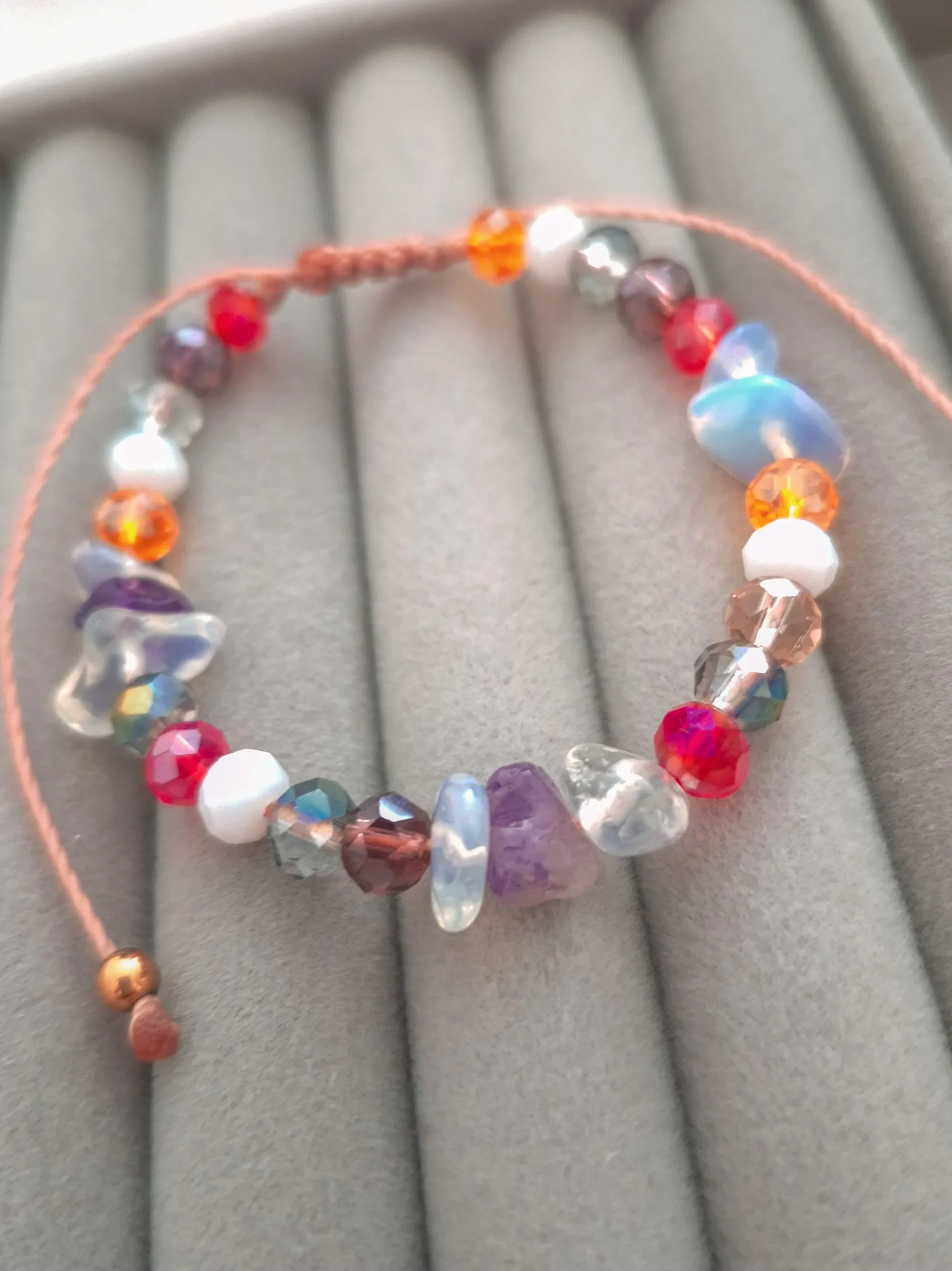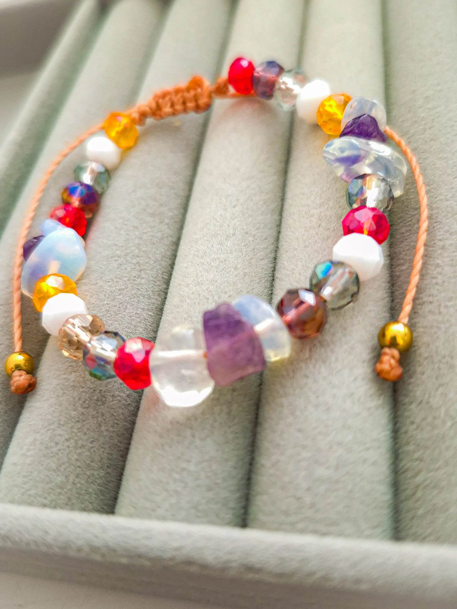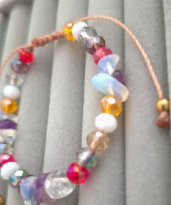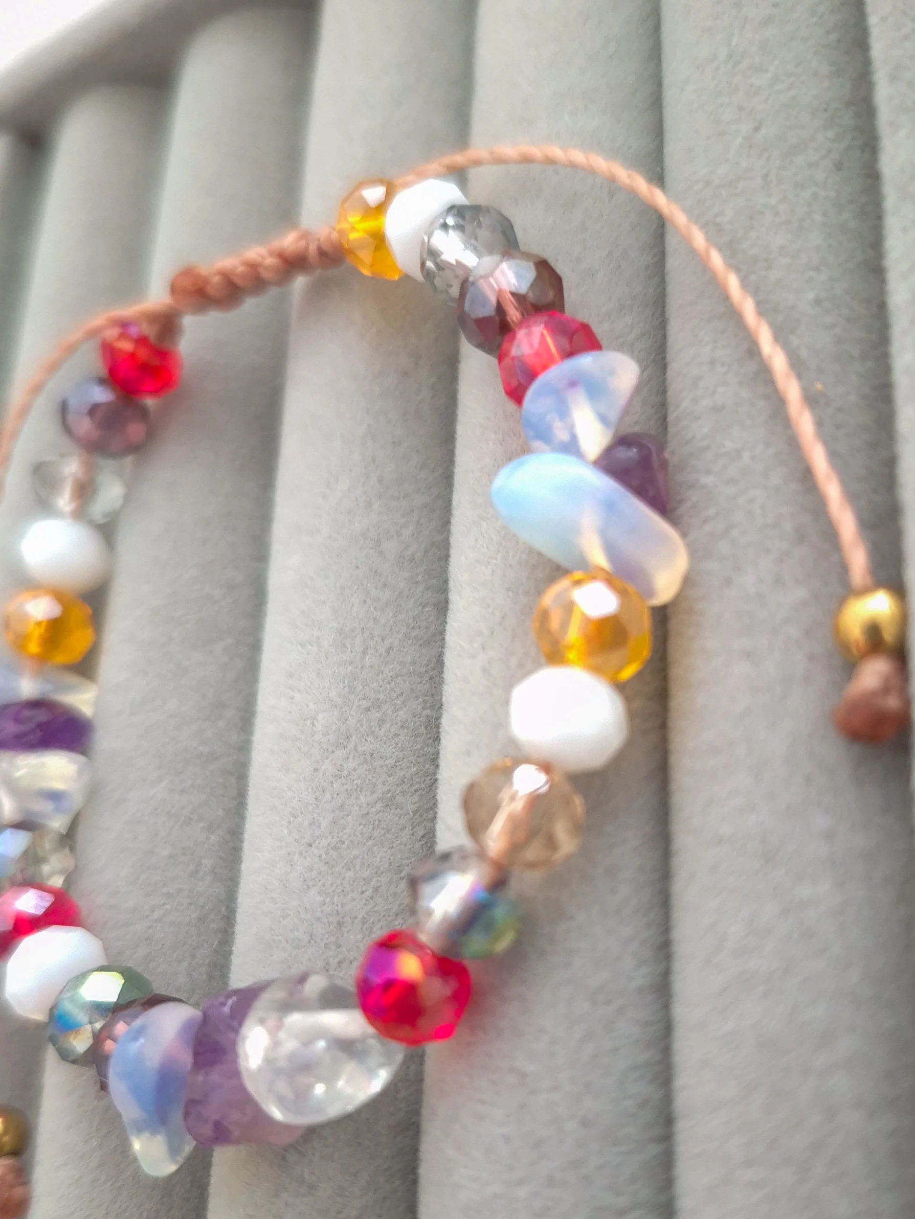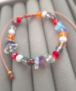 Hermosa Pulsera elaborada a mano con material de acero quirúrgico inoxidable, cristal murano multicolor y piedra cascajo natural, e hilo encerado, regulable.