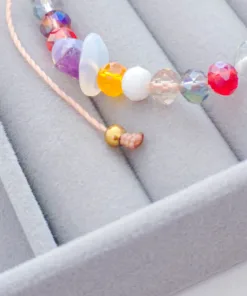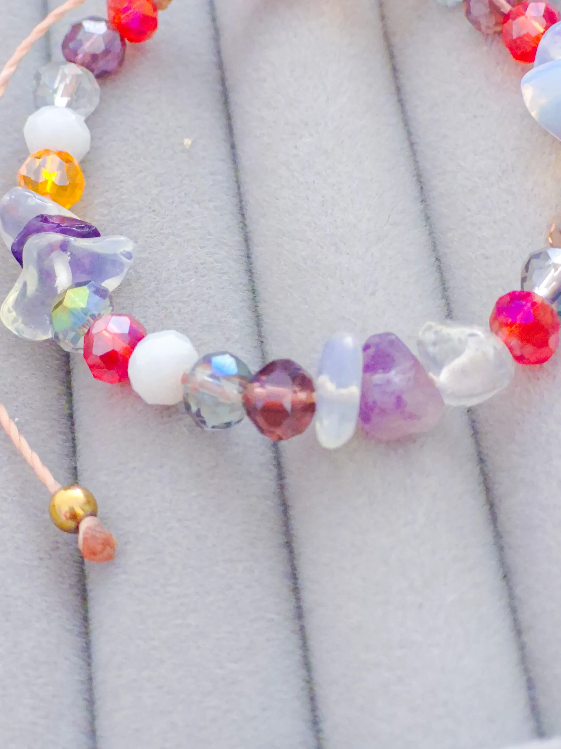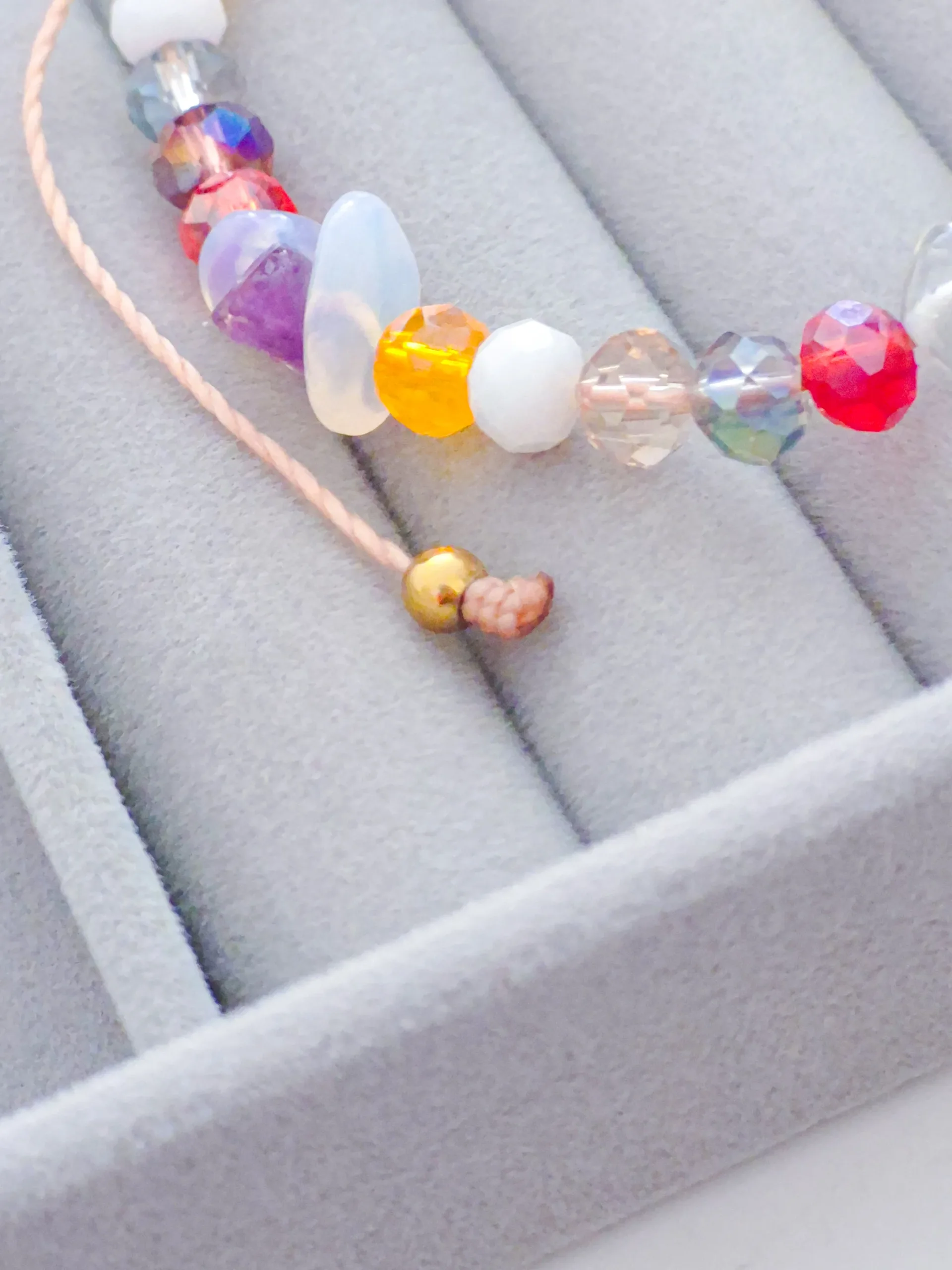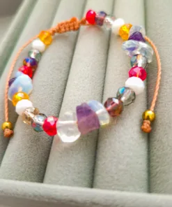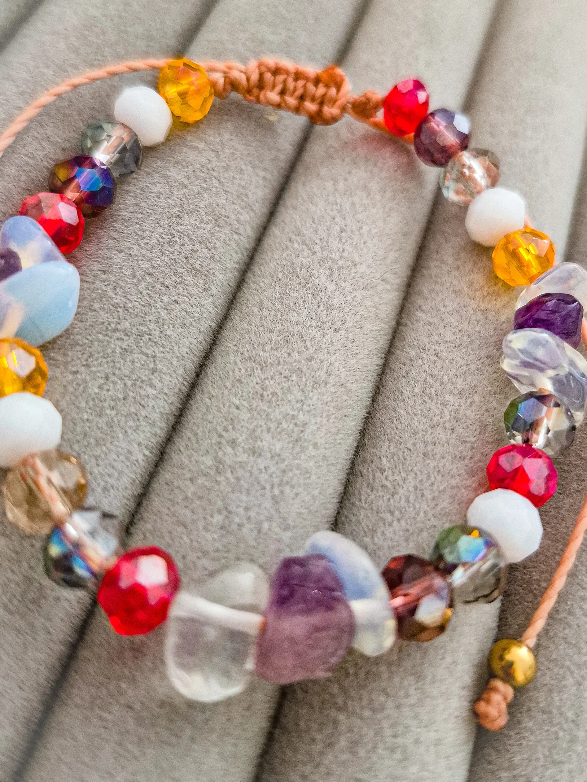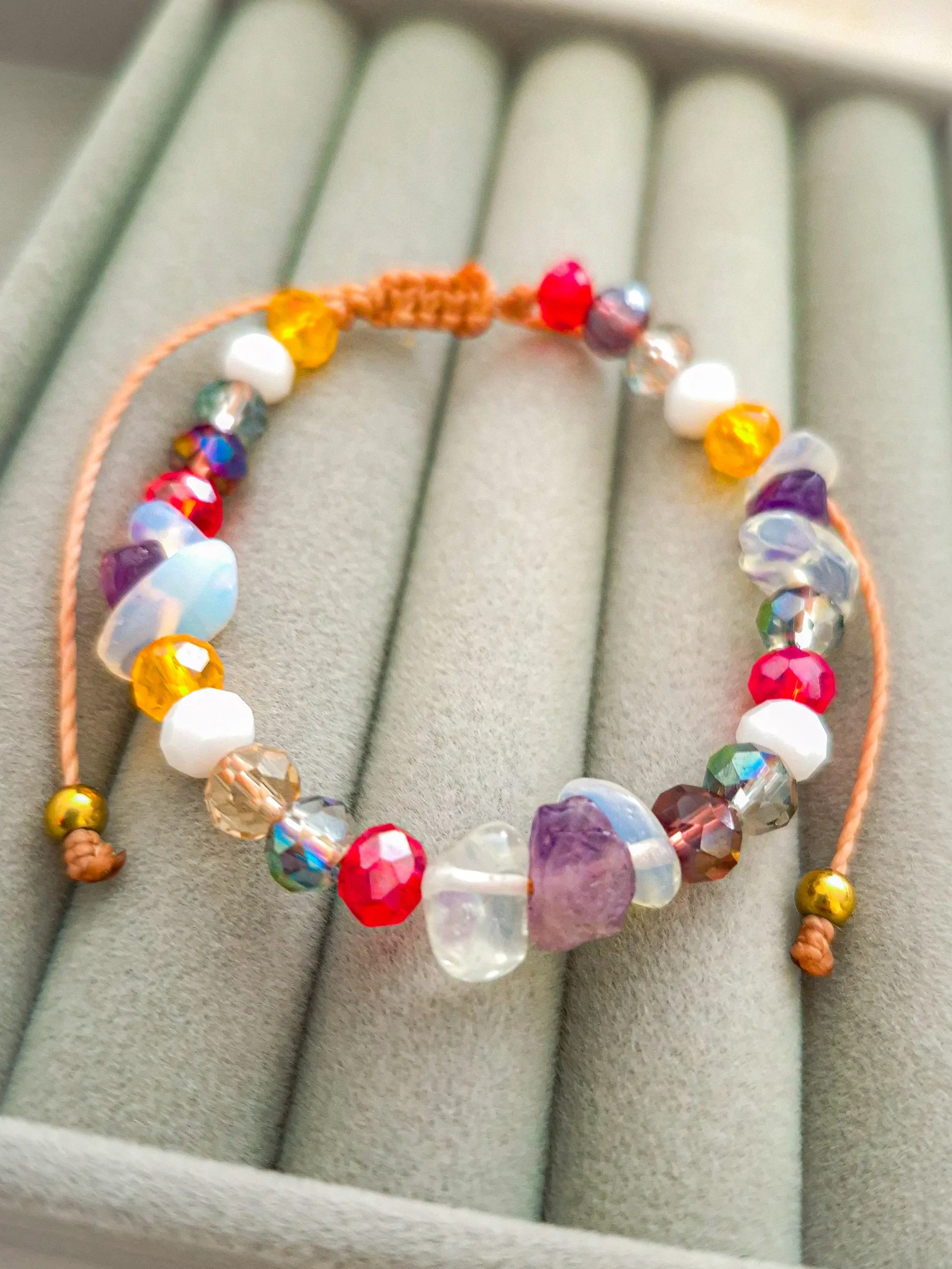 Hermosa Pulsera elaborada a mano con material de acero quirúrgico inoxidable, cristal murano multicolor y piedra cascajo natural, e hilo encerado, regulable.