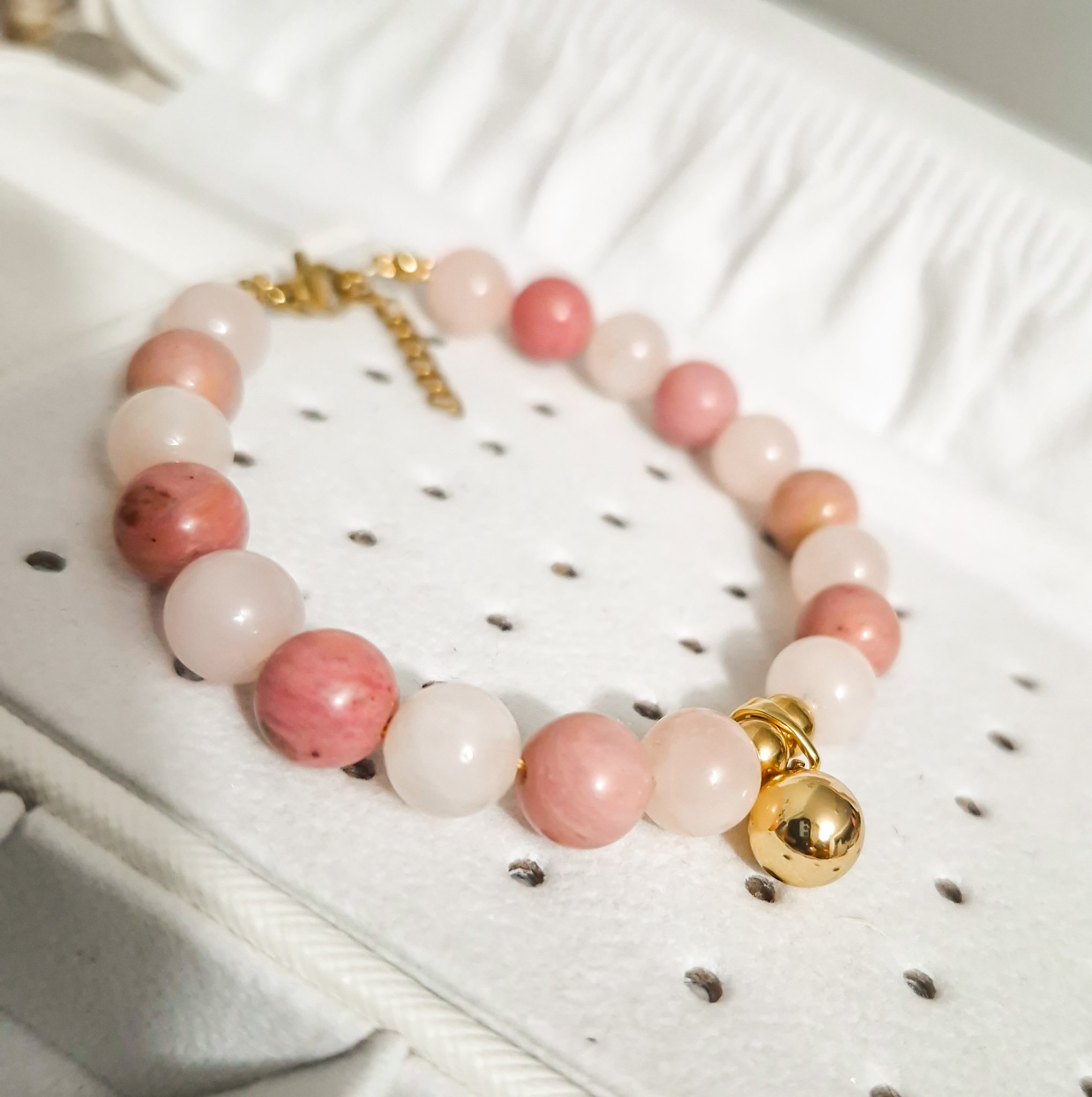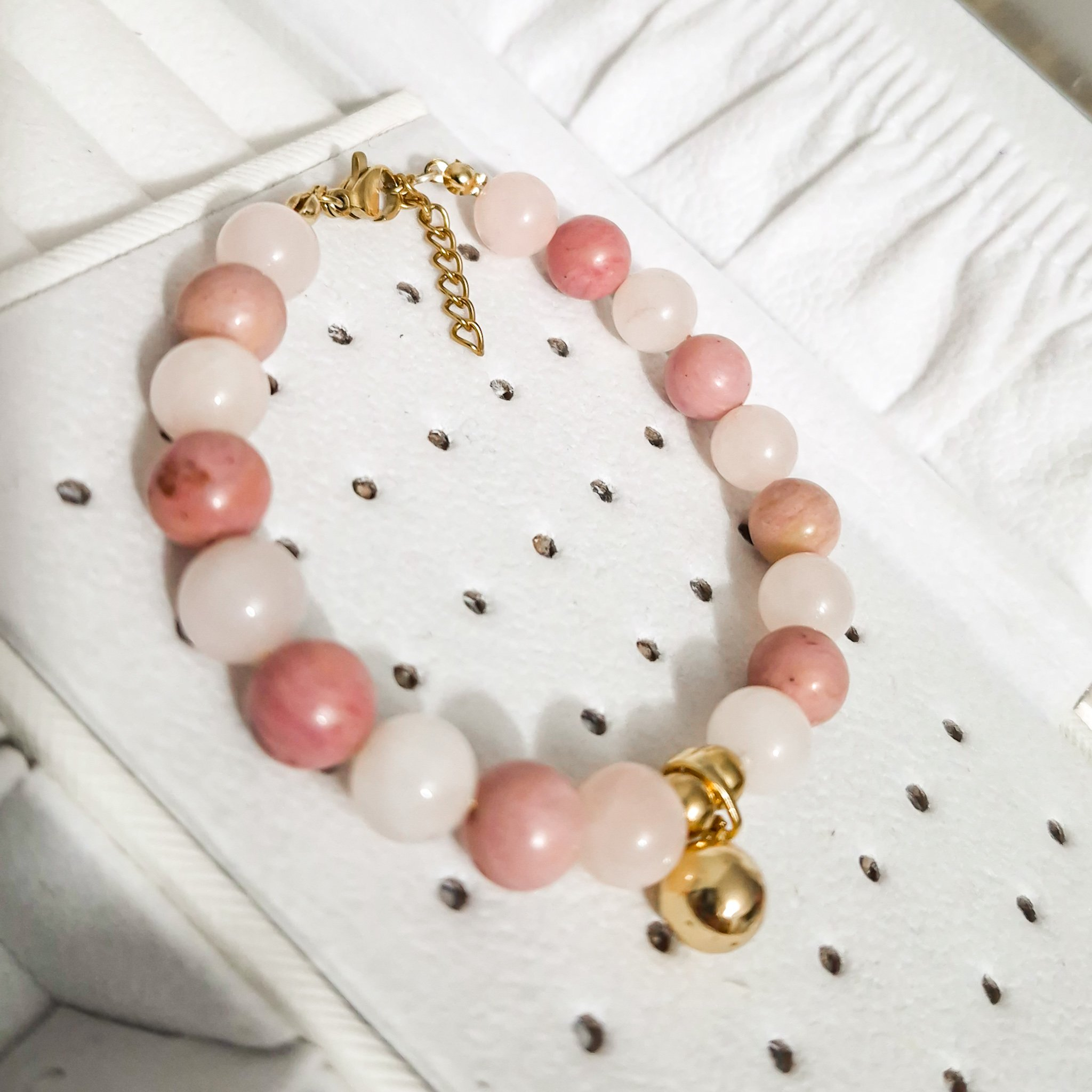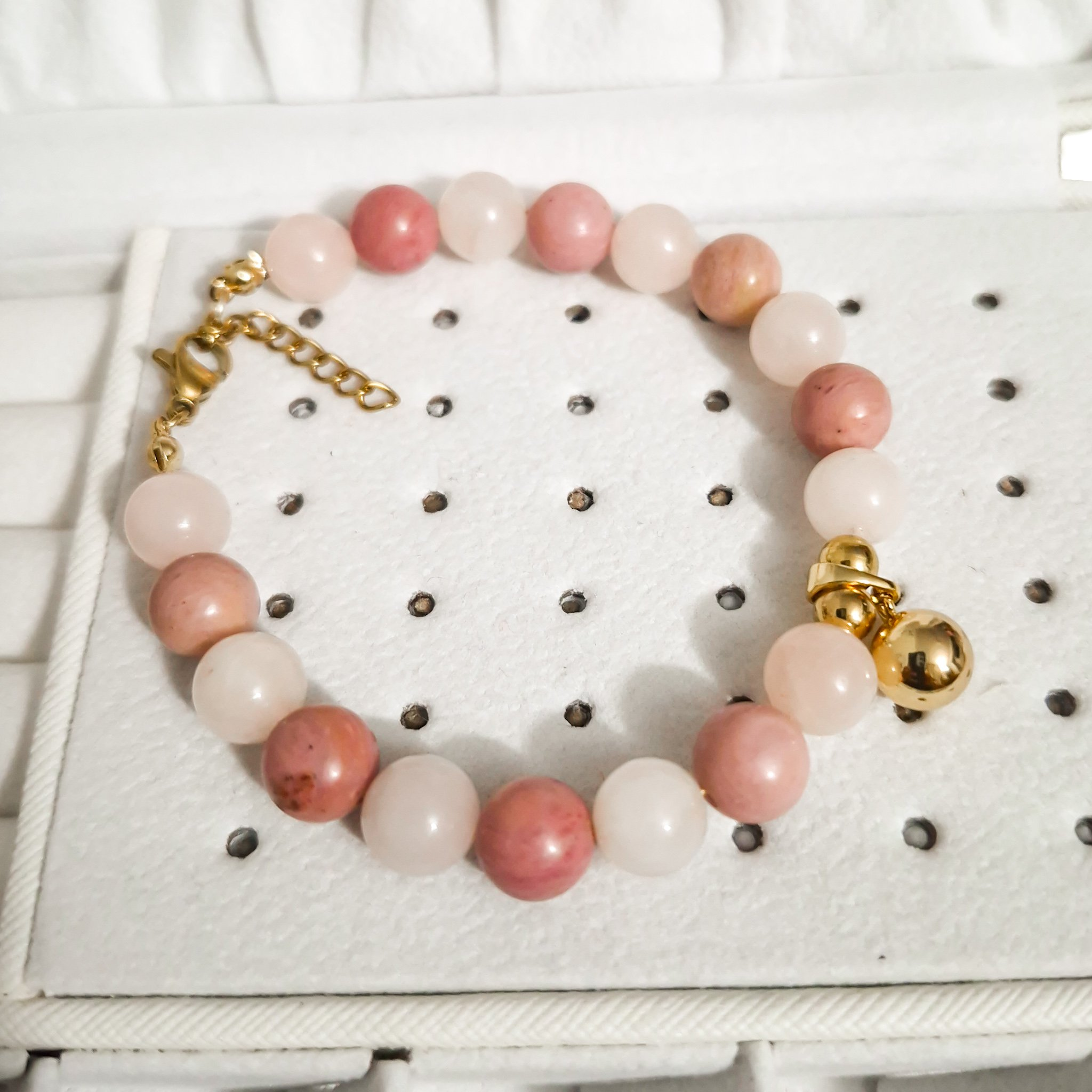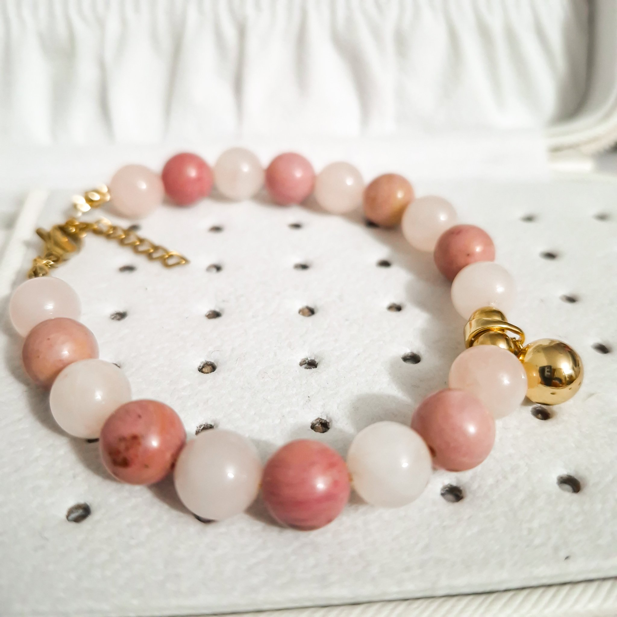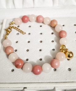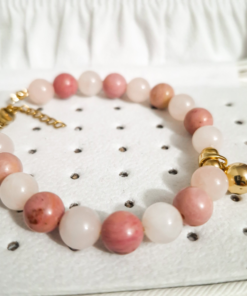 Dale un toque de armonía y elegancia a tu colección con esta hermosa pulsera artesanal elaborada con piedras naturales de Rodonita y Cuarzo Rosa, conocidas por sus propiedades energéticas y su delicado color rosado. Cada cuenta ha sido cuidadosamente seleccionada para garantizar una combinación equilibrada y sofisticada.