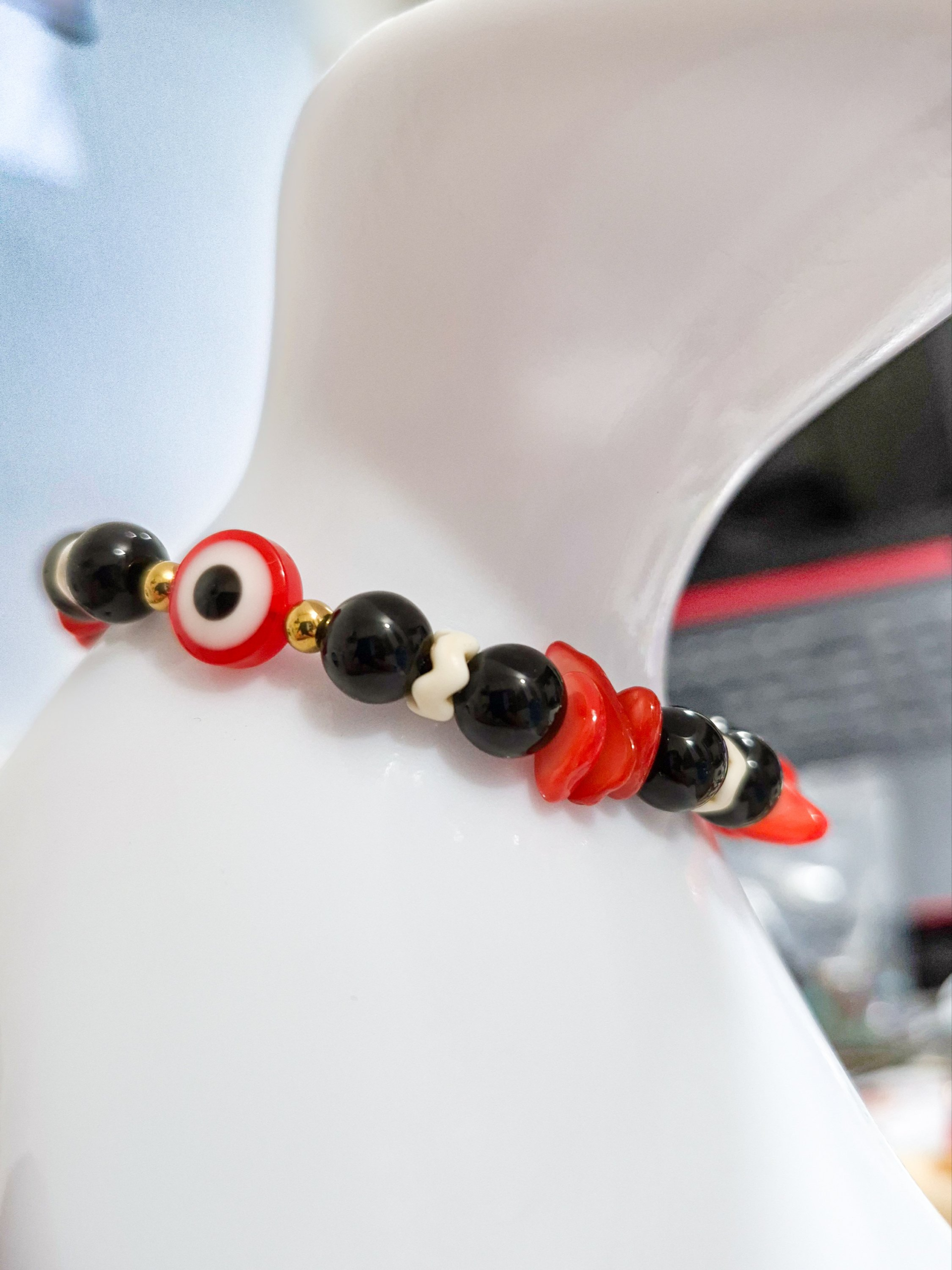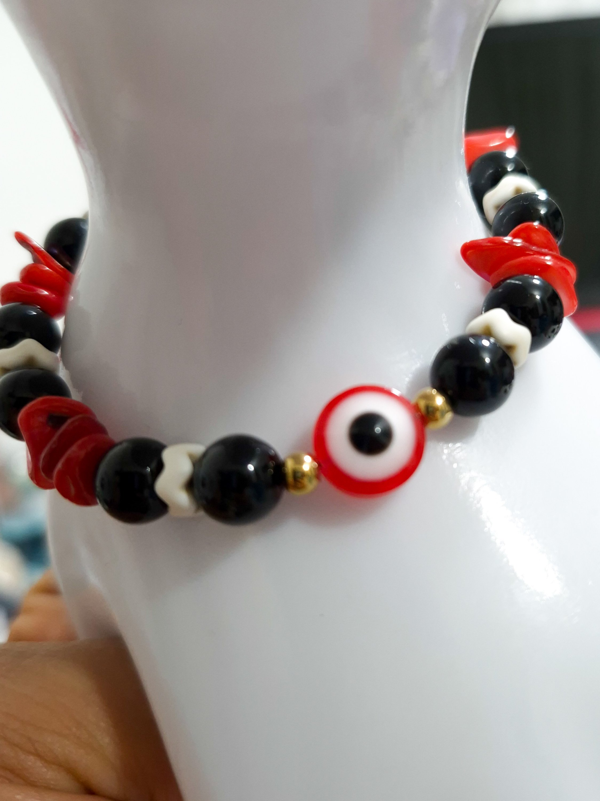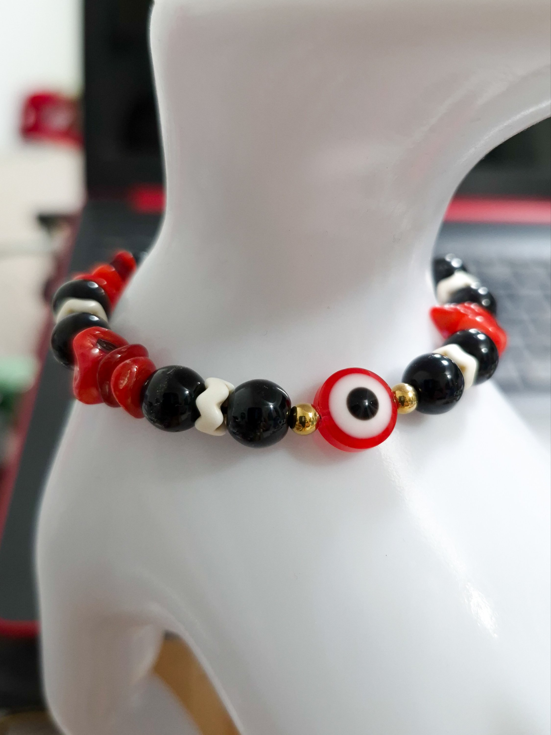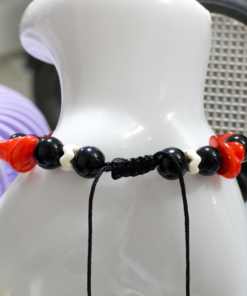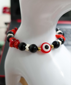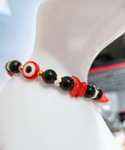 Eleva tu look con esta elegante pulsera artesanal elaborada con hilo chino resistente, detalles en acero quirúrgico y hermosas piedras de ónix combinadas con cascajos en tonos rojo y negro. Su diseño incorpora el poderoso ojo protector, símbolo de protección contra energías negativas.