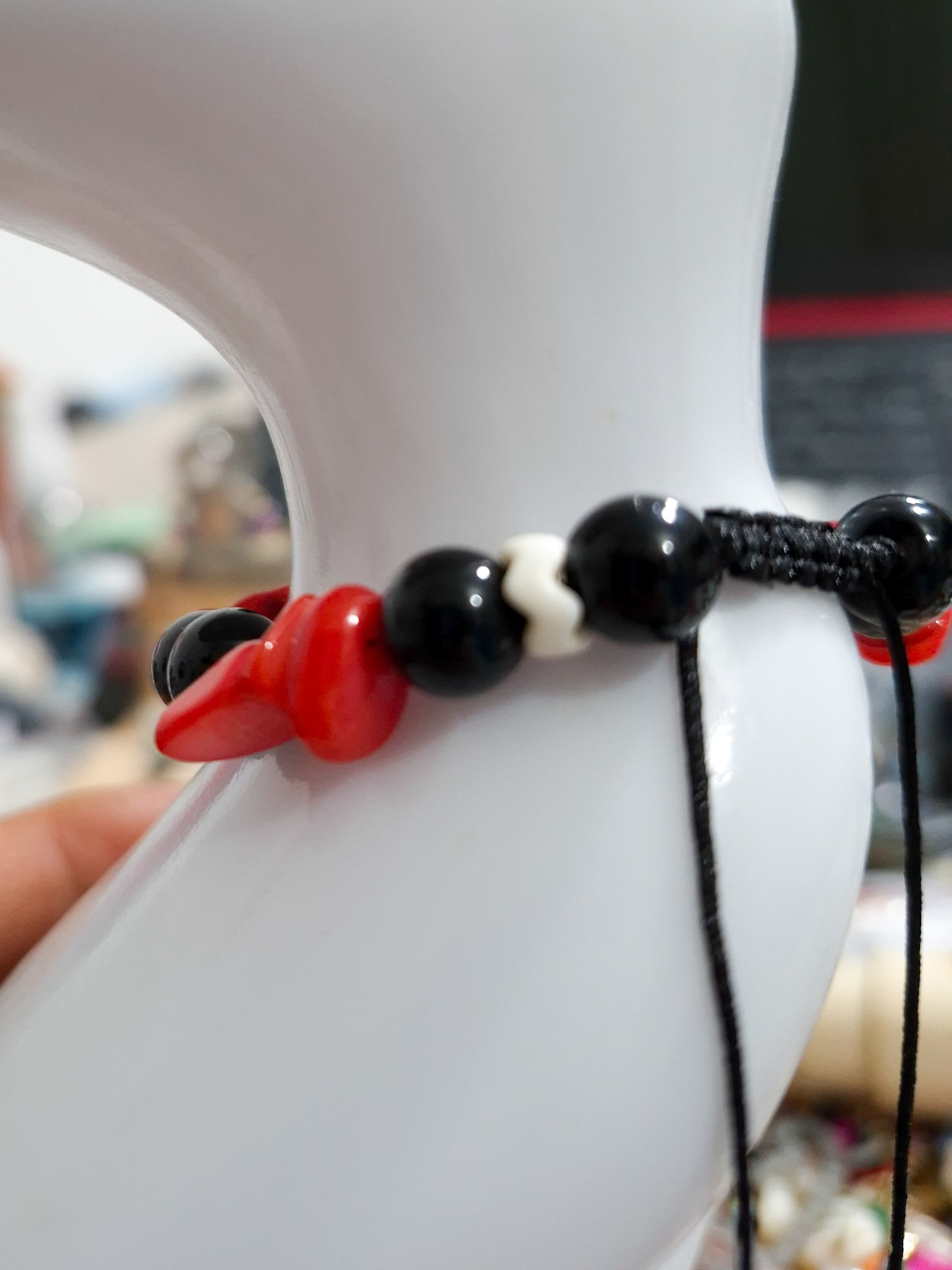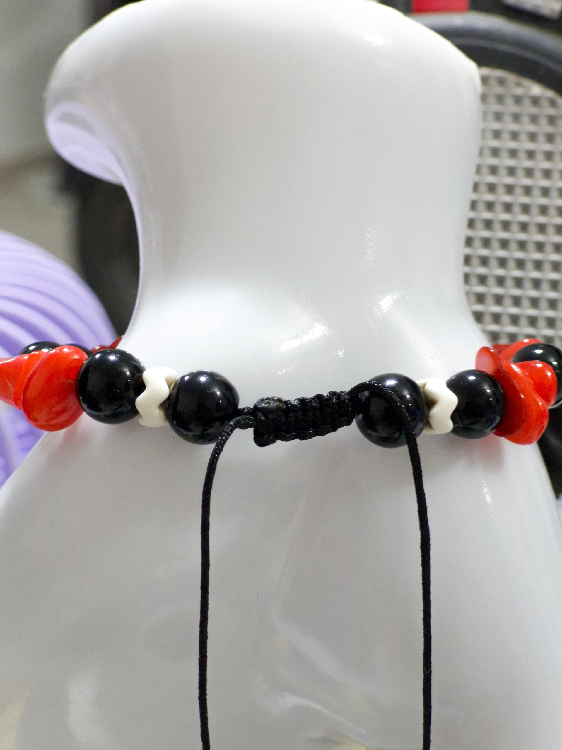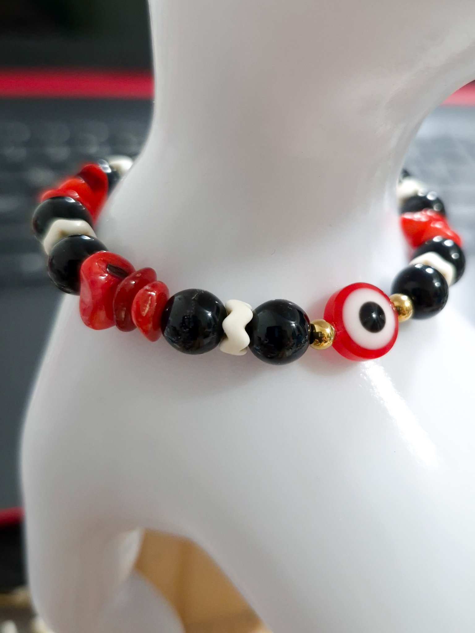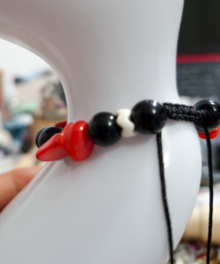 Eleva tu look con esta elegante pulsera artesanal elaborada con hilo chino resistente, detalles en acero quirúrgico y hermosas piedras de ónix combinadas con cascajos en tonos rojo y negro. Su diseño incorpora el poderoso ojo protector, símbolo de protección contra energías negativas.