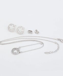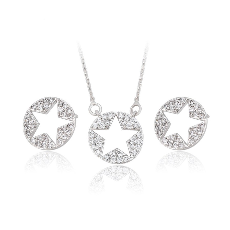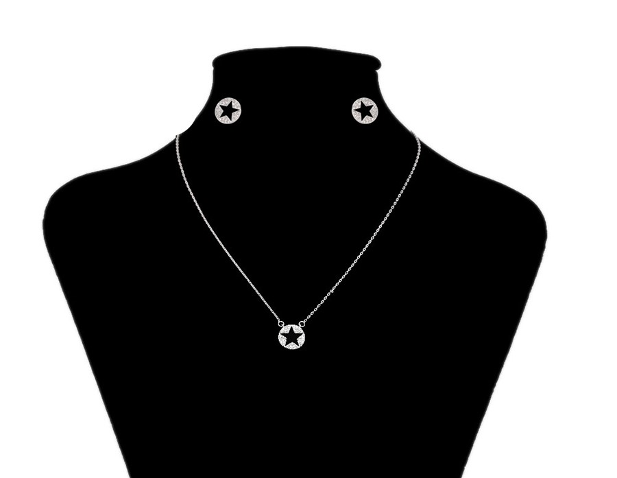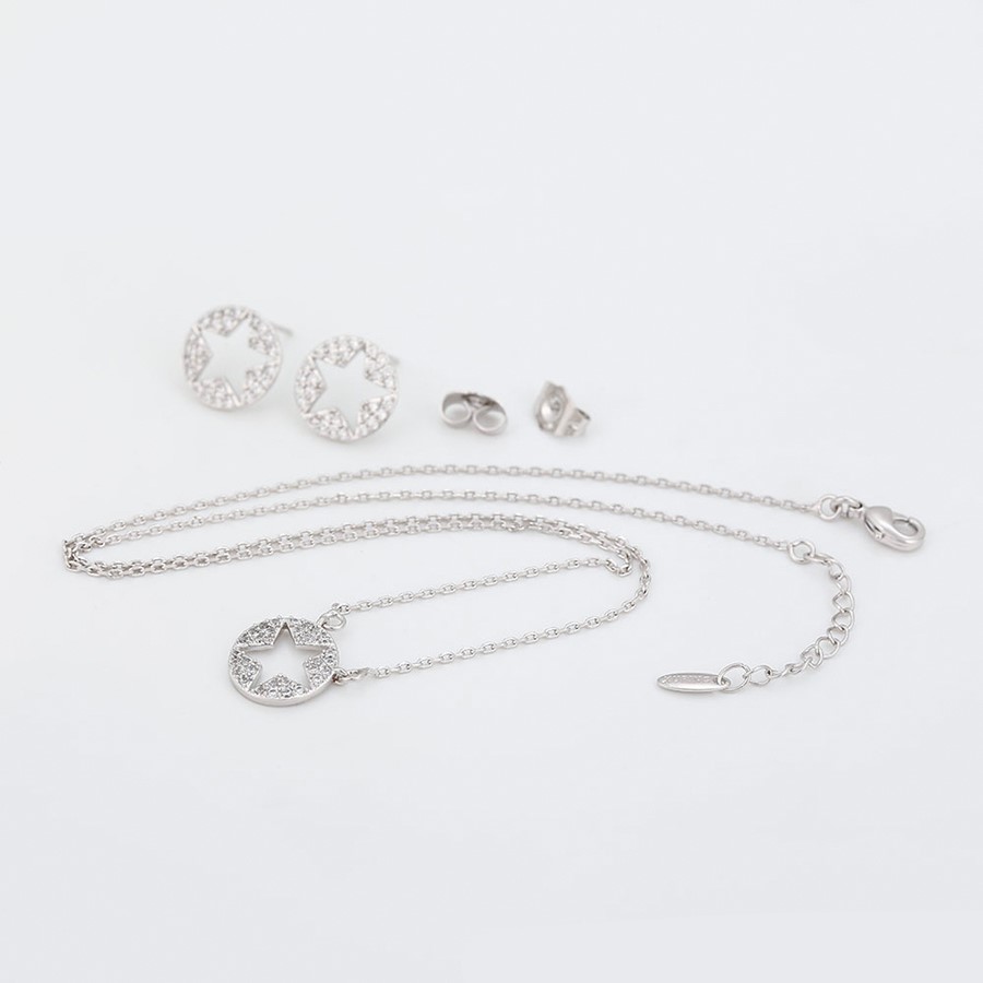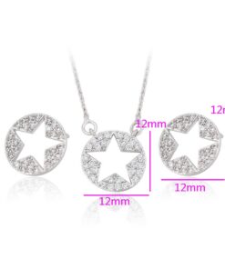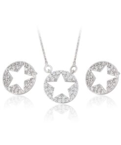 Hermoso set elaborado en Acero 316L. con doble baño de plata de ley 925, e incrustaciones de cristal swarovski, tiene forma de estrellas en todos los dijes.