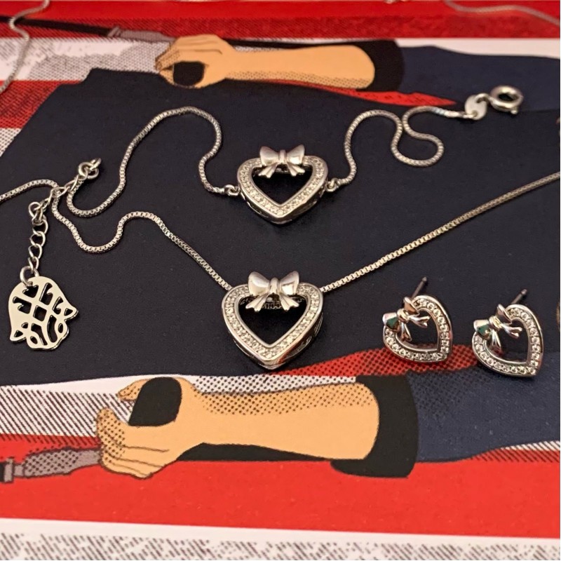 Fino y elegante set elaborado en Acero 316L, con doble baño de plata 925, e incrustación de cristal swarovski, juego de pulsera, collar y aretes.